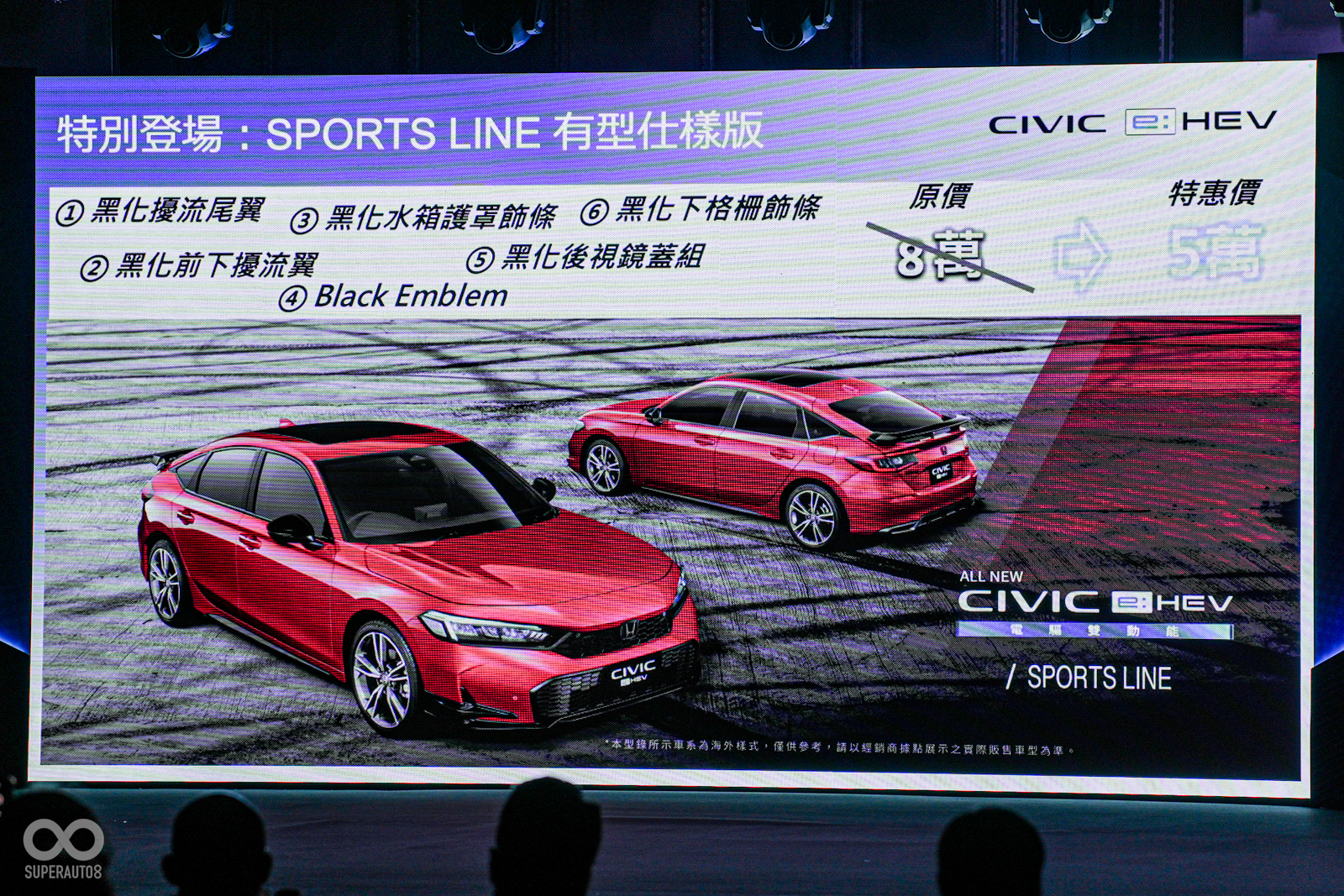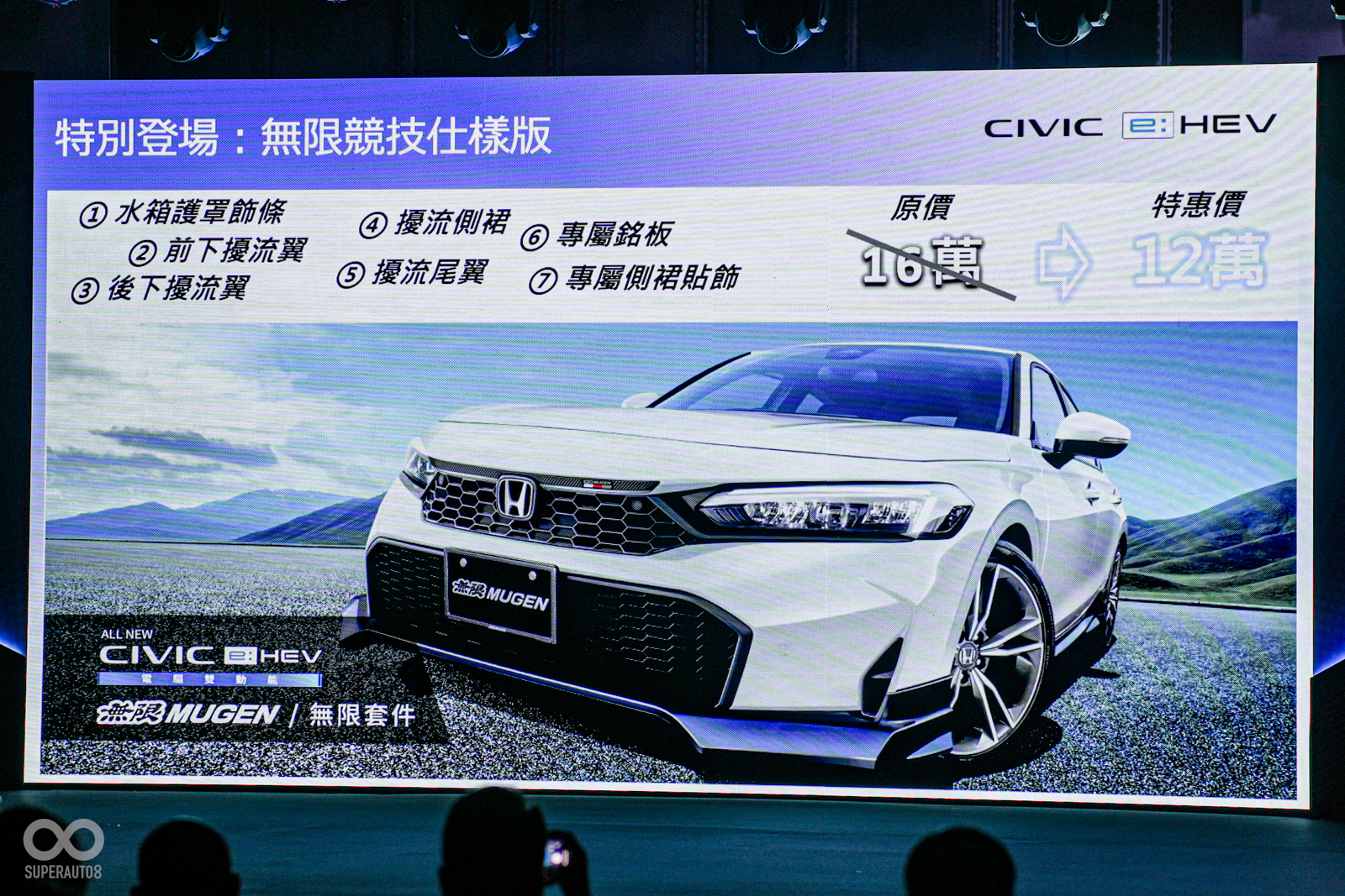 除了標配豐富,Honda更同步推出SPORTS LINE與MUGEN無限兩套外觀個性化套件。SPORTS LINE以黑化後視鏡、水箱護罩、下格柵與尾翼等元素強化外觀張力,而MUGEN版本則結合前後擾流、側裙、尾翼與無限專屬銘版,展現本田賽道基因與熱血精神。