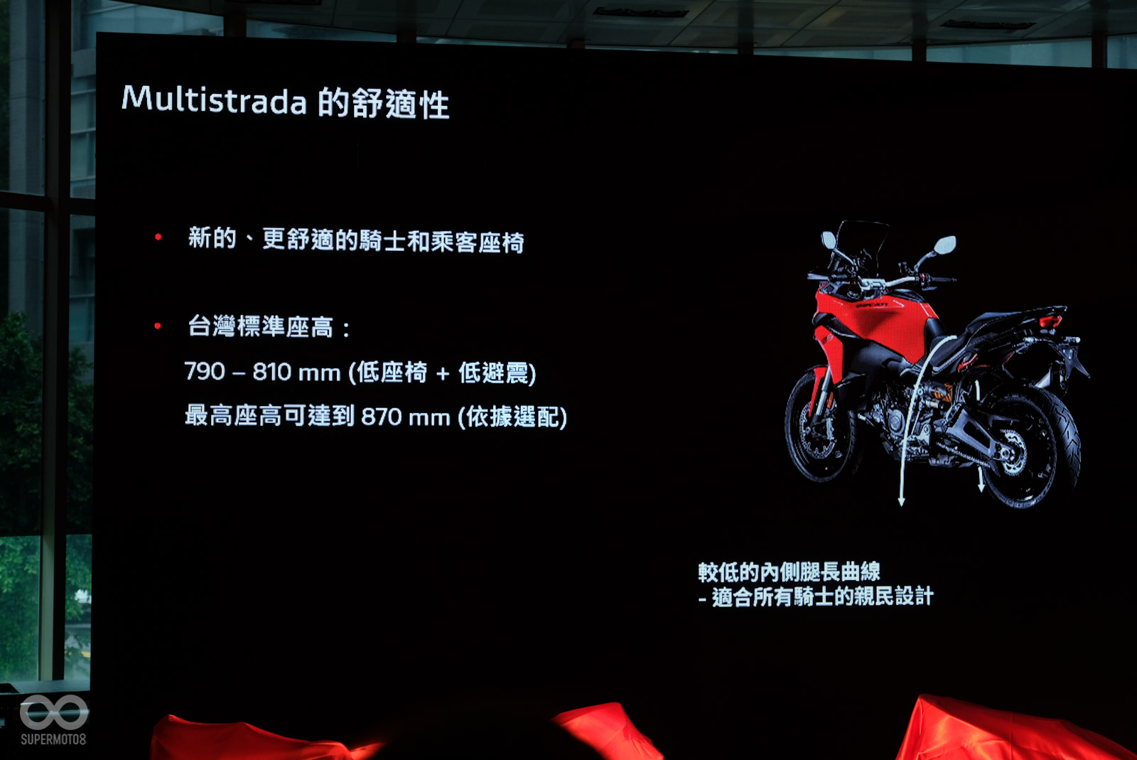 座高調整範圍為 790 mm 至 810 mm(台灣版本),搭配升級座墊與乘客空間,提升長途耐乘性。懸吊系統則採用 Ducati Skyhook 半主動電子避震,支援「最低預載」功能與三種獨立懸吊模式,依照路況自由選擇舒適性與穩定性。