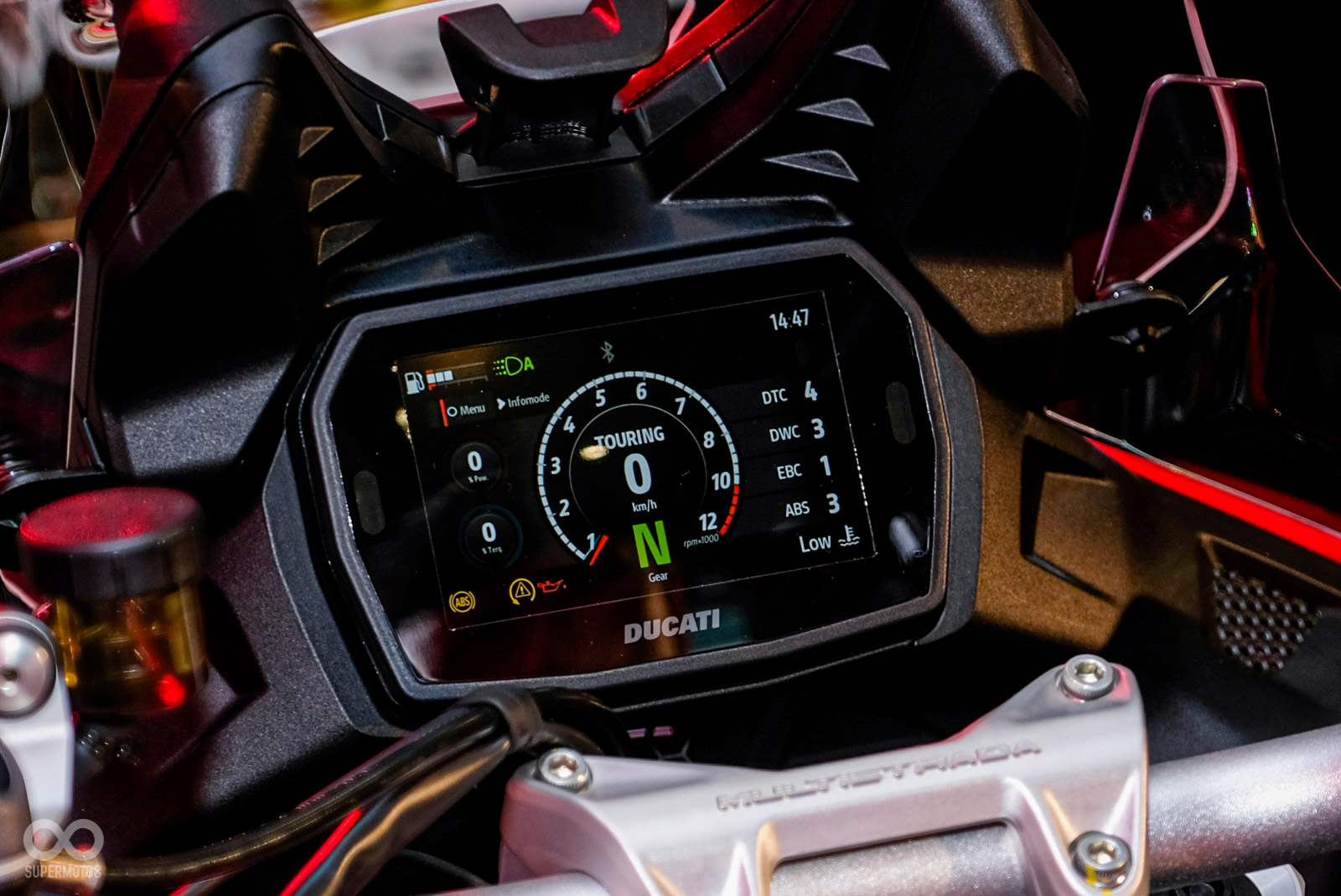 標配 六軸 IMU,並具備 ABS Cornering、DTC、DWC、EBC、DQS 2.0 快排、Pit Limiter 與 Ducati Power Launch。新設計的 5 吋全彩 TFT 儀表支援多種顯示模式與換檔提示燈,操作按鈕則採多向式設計,可選配多媒體系統與導航功能。