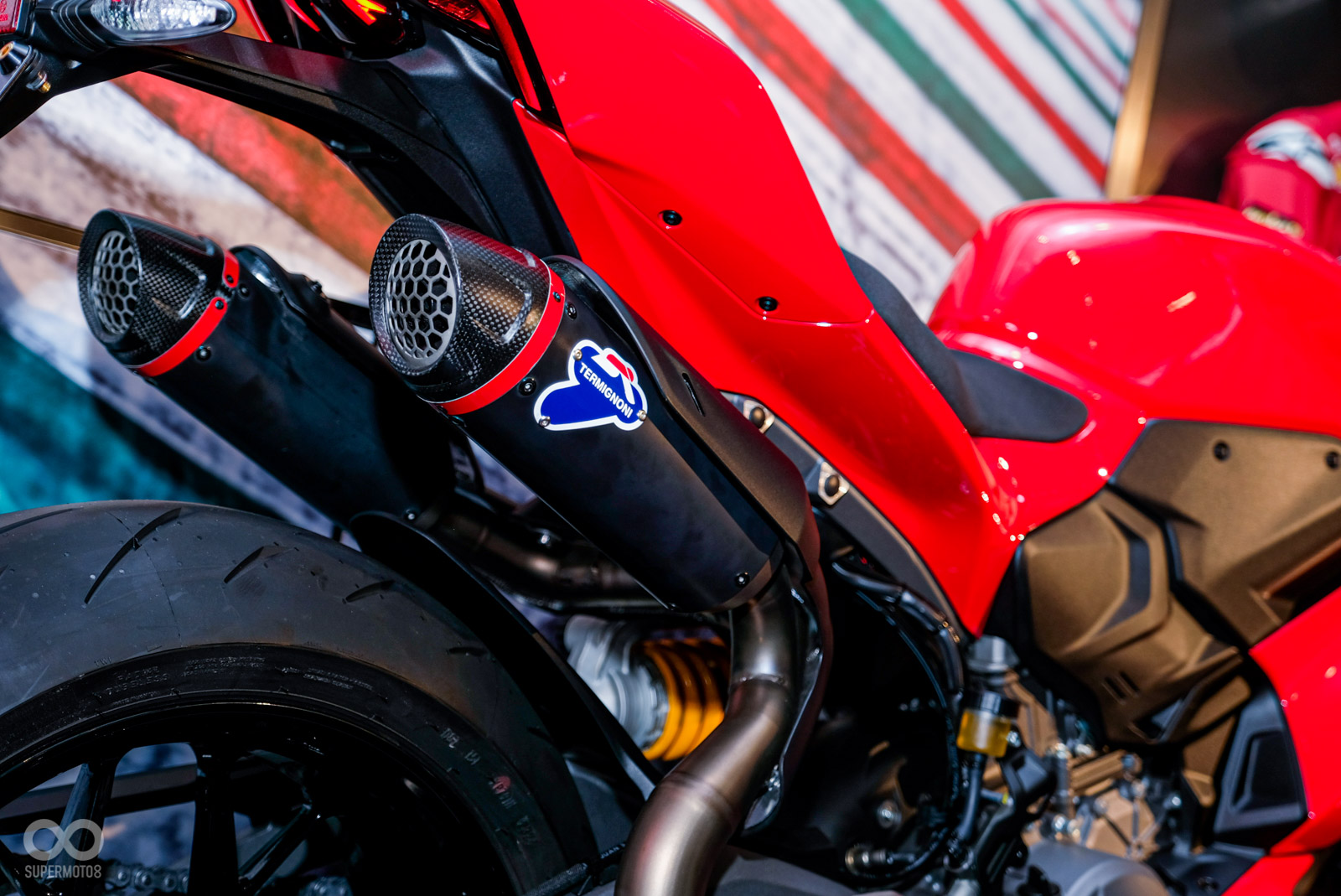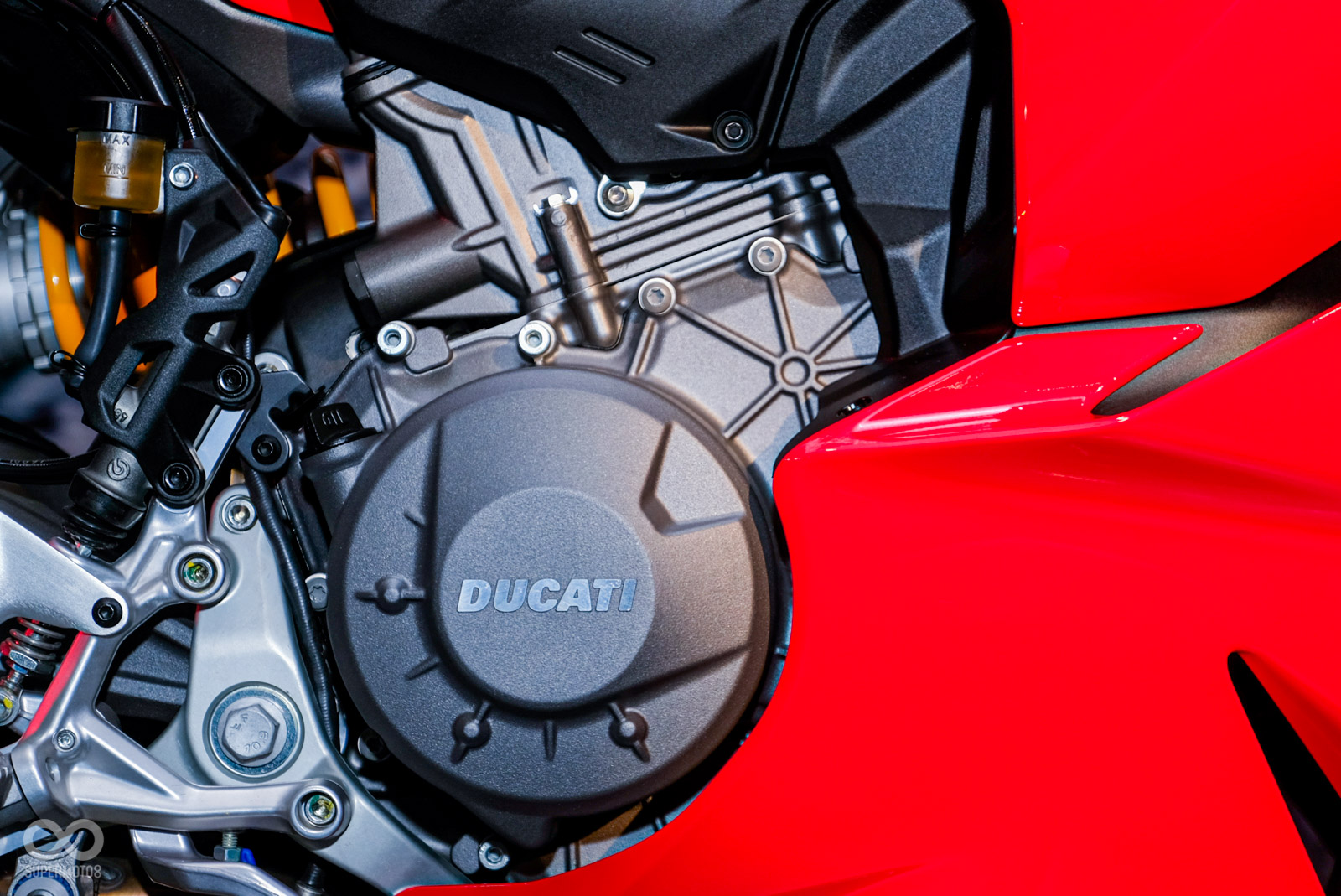搭載 全新 890 cc 90° V 型雙缸引擎,輸出高達 120 hp / 93.3 Nm,引擎本體僅重 54.4 公斤,是 Ducati 歷來最輕雙缸設計,並通過 Euro 5+ 排放認證。可選配 Termignoni 賽道排氣系統(126 hp,減重 4.5 公斤,僅限賽道使用),讓熱血玩家可進一步解放性能潛力。