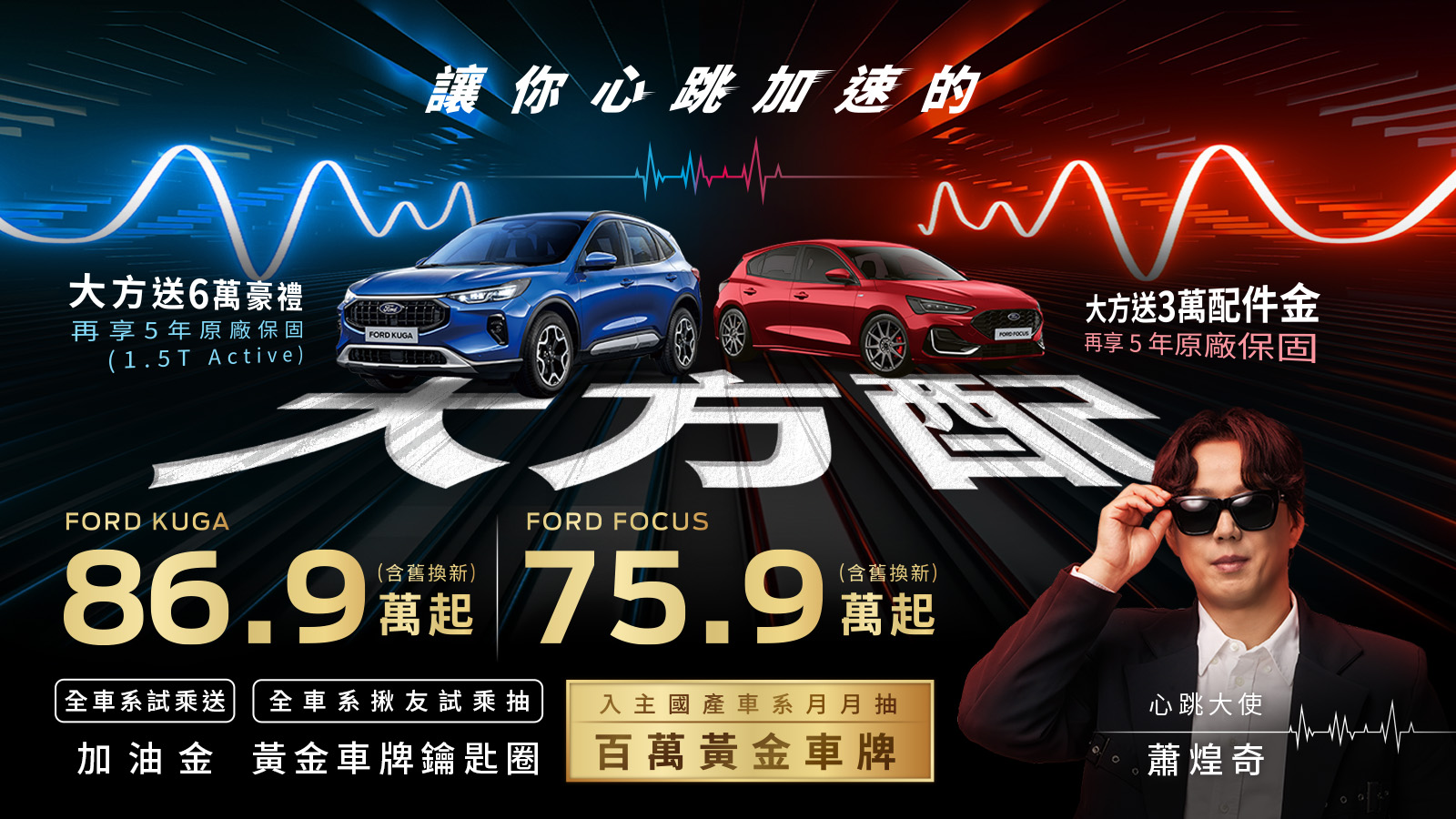 福特六和攜手榮獲四座金曲獎「最佳台語男歌手」的心跳大使蕭煌奇,推出「大方配」購車優惠方案,2025年5月30日起至2025年6月30日止,凡至全台Ford展示中心試駕全車系,即可獲得加油金,揪好友試駕再抽黃金車牌鑰匙圈,入主國產車系再加碼月月抽百萬黃金車牌!
