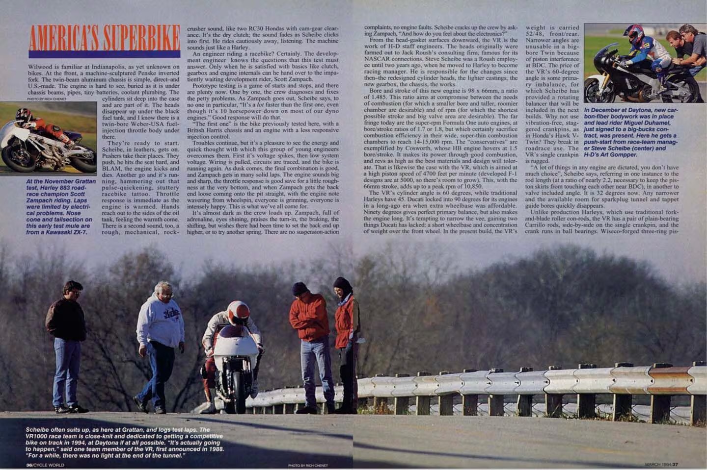 即便如此,團隊仍不放棄研發,曾在 Daytona 跑出驚艷全場的排位圈速,成為最閃亮的一刻。實際參賽方面,VR1000 自 1994 年起登上 AMA Superbike 賽場,雖未曾奪冠,但 1996 年在 Mid-Ohio 站曾因紅旗提前結束而與勝利擦肩而過,創下最佳成績第二名;同年也曾於 Pomona 取得桿位,展現潛力,可惜持續的機械問題與資源短缺最終讓計畫無法推進,留下一段差點成功的賽道傳奇。