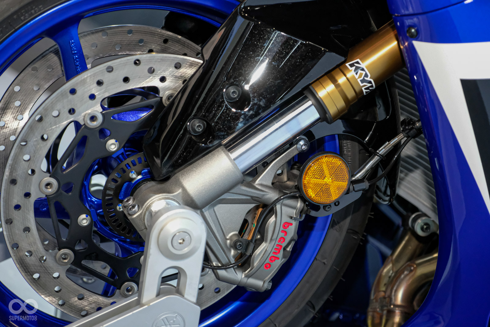 車架方面,R9 採用全新設計的 Deltabox 鋁合金車架,結合輕量化搖臂與 195 公斤裝備重量,實現極高的剛性與靈活性。搭配 KYB 全可調 43mm 倒立式前叉、KYB 多連桿後避震,進一步加強車輛在賽道與街道雙向使用時的支撐性與回饋感。
