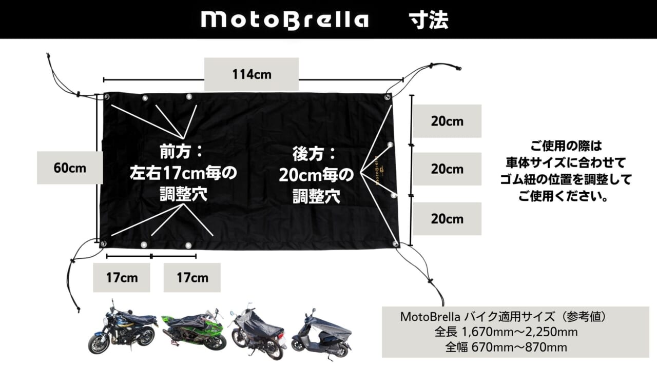 另外,這個罩布可以適用大多數機車,無論是黃牌、紅牌還是白牌速克達都可以用,車長從 1670mm 到 2250mm、車寬從 670mm 到 870mm 都能對應,基本上不用擔心尺寸問題。