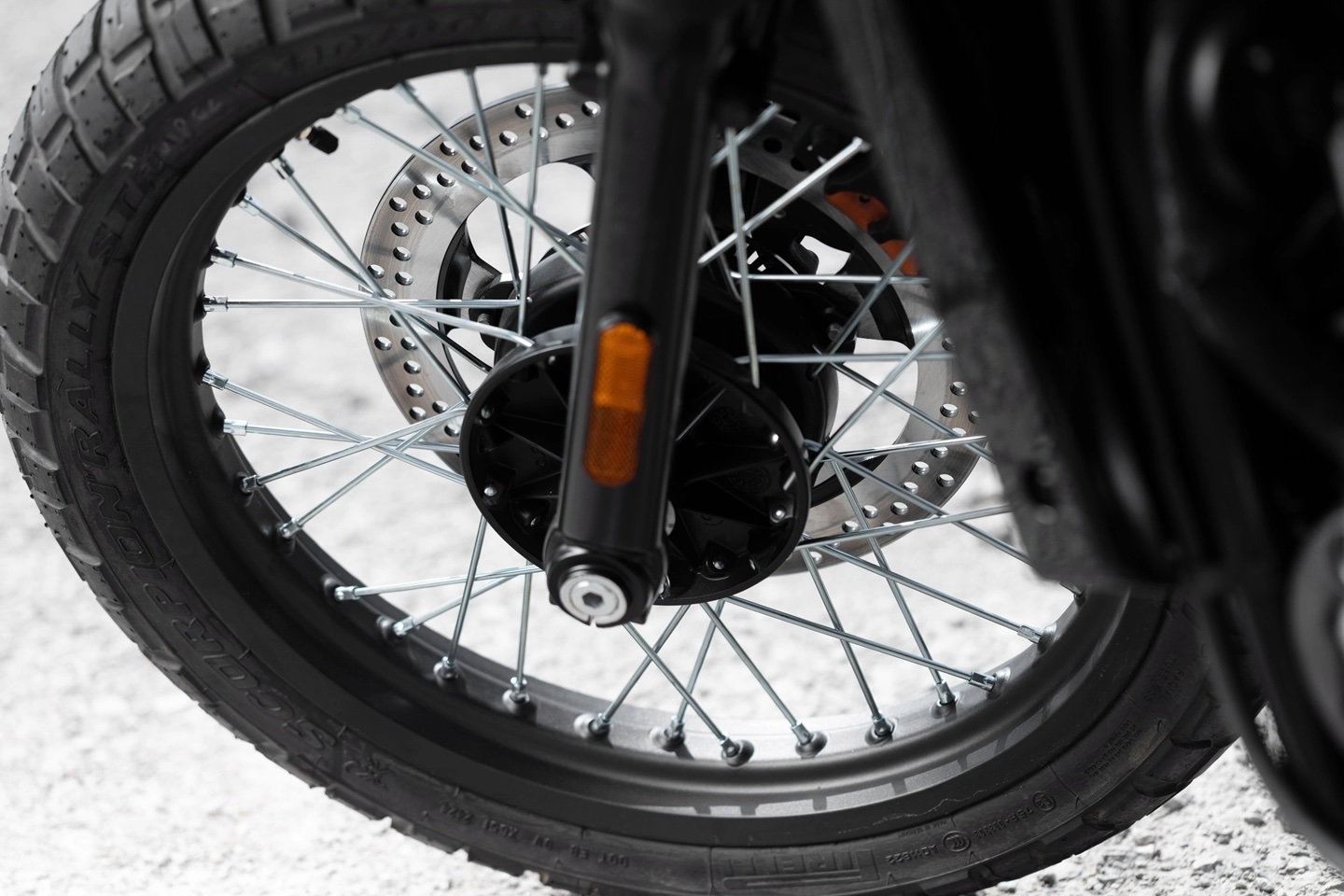 Scrambler 650 的懸吊系統前為 41mm 的正立式前叉,後方則是預載可調的雙槍避震器,共五段阻尼設定可供調整,照顧到不同體型與騎乘偏好的使用者。前輪配置 110/80-19 的越野胎,後輪則是 150/70-17,搭配鋼絲框與 Pirelli Scorpion Rally STR 輪胎組合,實用性與抓地力兼具。