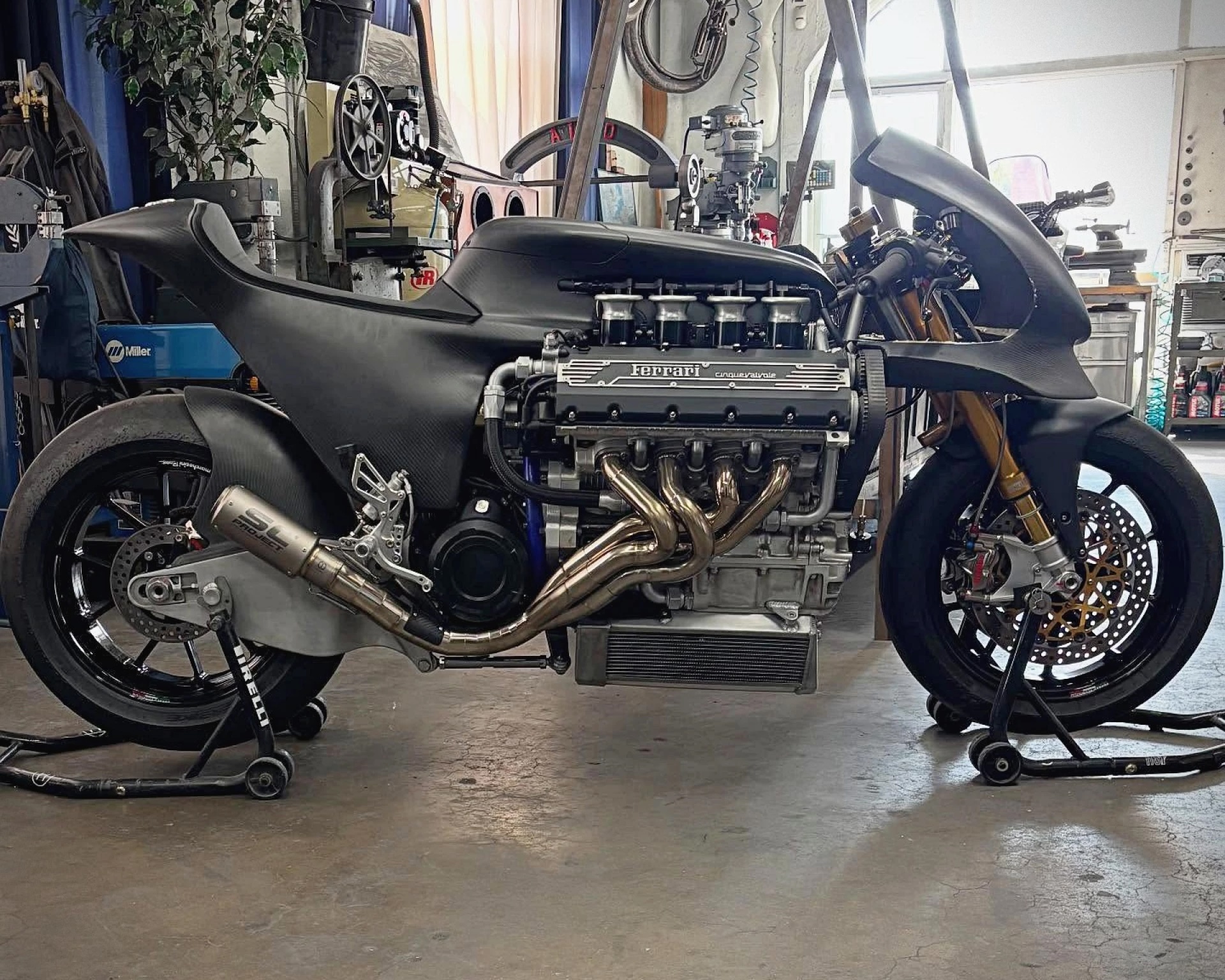 你沒看錯,這不是什麼 Photoshop 惡搞。美國改裝鬼才 Max Hazan 真的把 Ferrari F355 的 3.5L V8 引擎裝進一台手工打造的 Cafe Racer,命名為 HF355。這具自然進氣 V8 原本是 90 年代 Ferrari 跑車的心臟,最大馬力 400 匹、轉速逼近 10,000 rpm,現在它成了這台重機的主角。