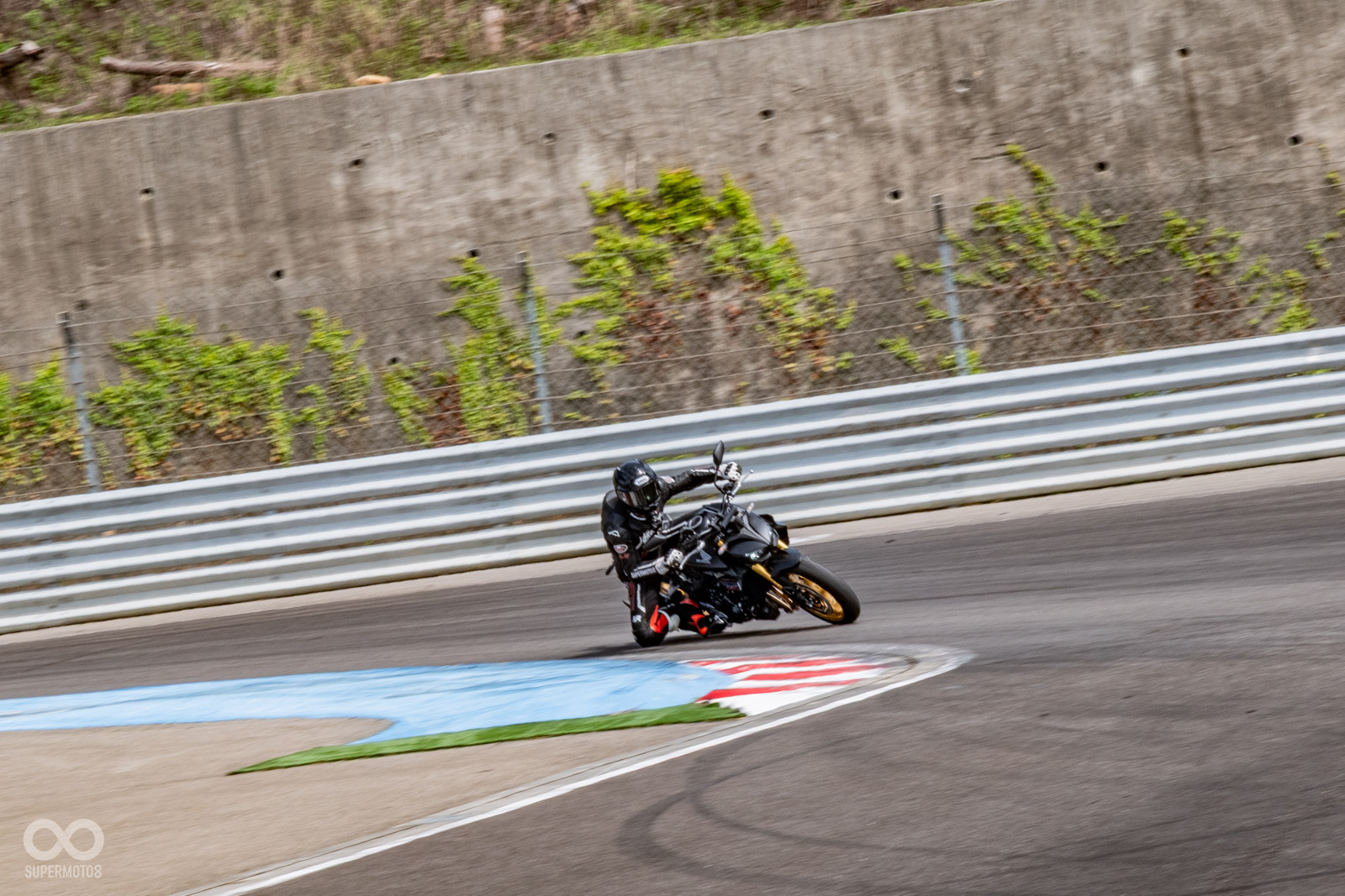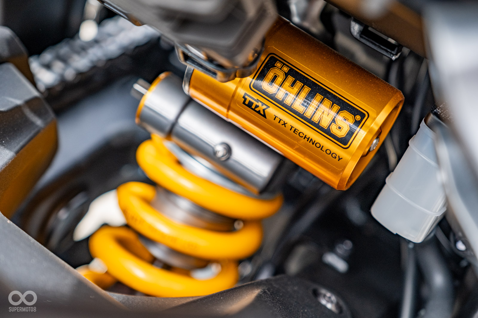 懸吊表現更是讓人印象深刻。無論是 Showa 前叉還是後方 Öhlins TTX36,雖然調校偏向舒適,遇到連續彎道時依舊能給人穩定支撐,不過隨著速度加快,出廠設定偏向舒適的調性難以忽略,幸好懸吊前後皆為全可調形式對應各種需求,另外腳踏在大傾角下位置偏低,隨時會提醒你騎太殺囉。