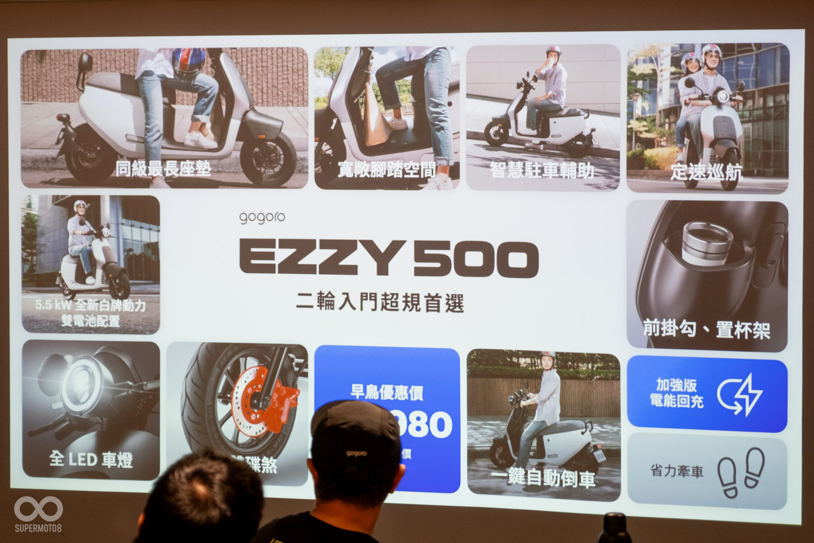 EZZY 500 採用白牌設定,搭載雙電池。核心採用 5.5kW 馬達,極速可達 82 km/h,官方續航則是 150 公里,對比 EZZY 的 79 公里則是高出不少。