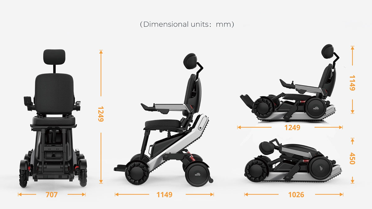 XSTO X12 採用皮帶驅動爬梯技術,搭配 360 度自動平衡座椅,即使在樓梯上也能保持穩定。越野能力方面,砂石、雪地、坑洞都不在話下,靠的是獨立四輪動力系統與強化底盤。操控方式為單一搖桿,AI 系統可自動判斷地形、切換模式並偵測障礙物與落差,使用者只需專注前進。