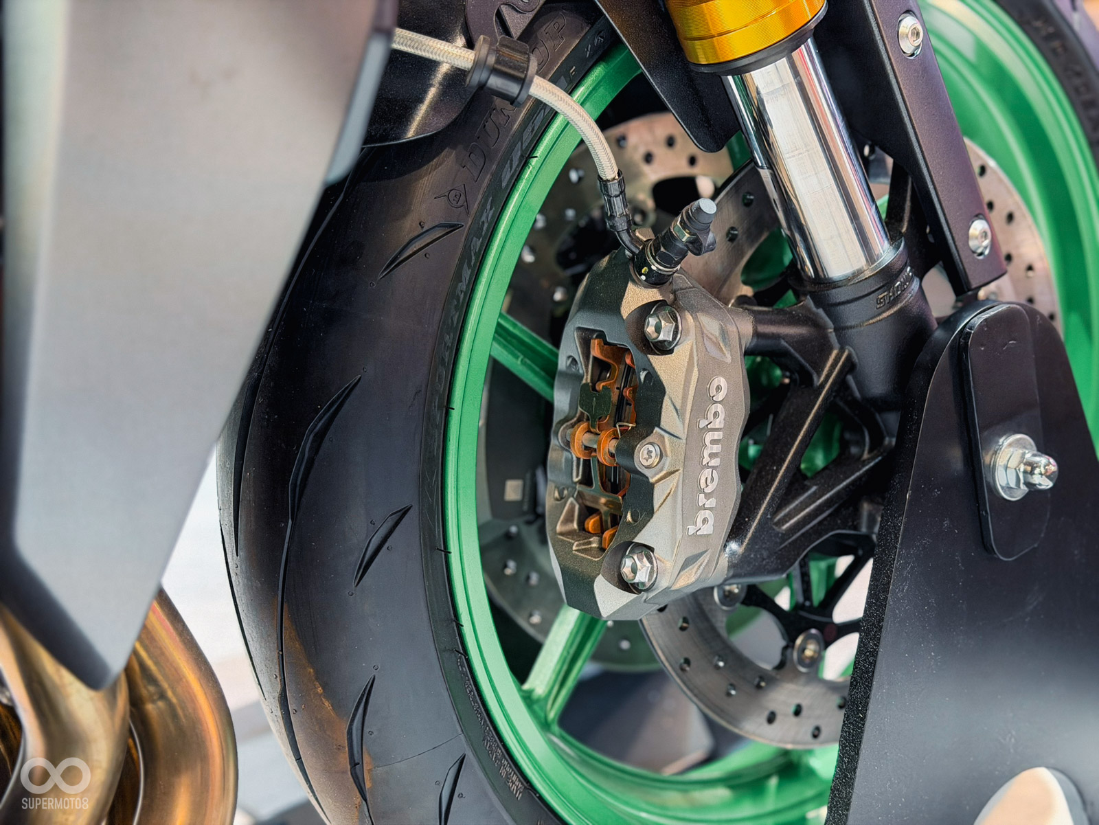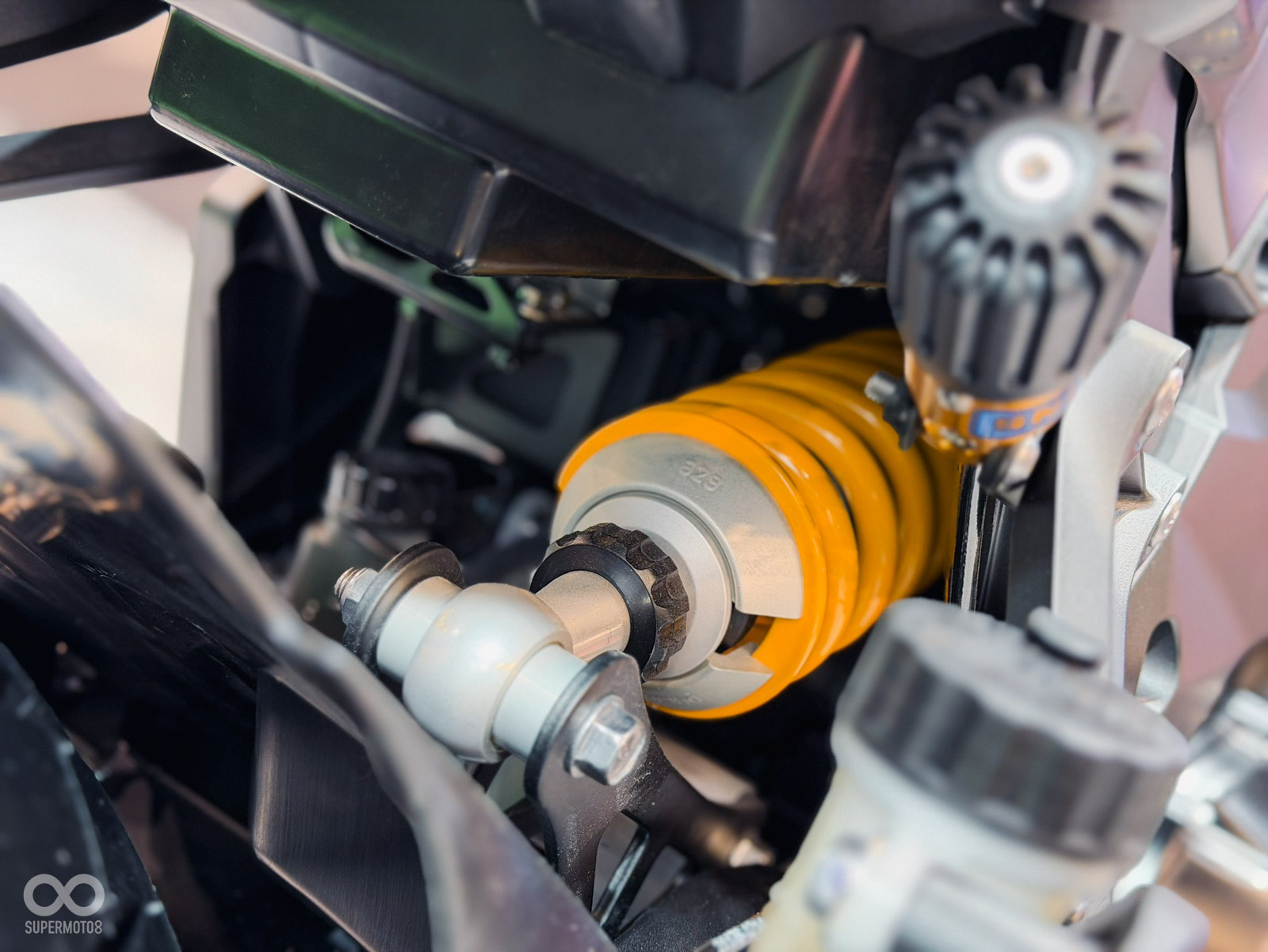 標準版已具備單體卡鉗與 Ø310mm 碟盤,SE 更升級 Brembo 煞車、金屬油管與 Öhlins S46 後避震,並搭載 Dunlop Sportmax Q5A 運動胎,展現頂級 Supernaked 規格。座高為 815mm 、車重為 221 公斤。