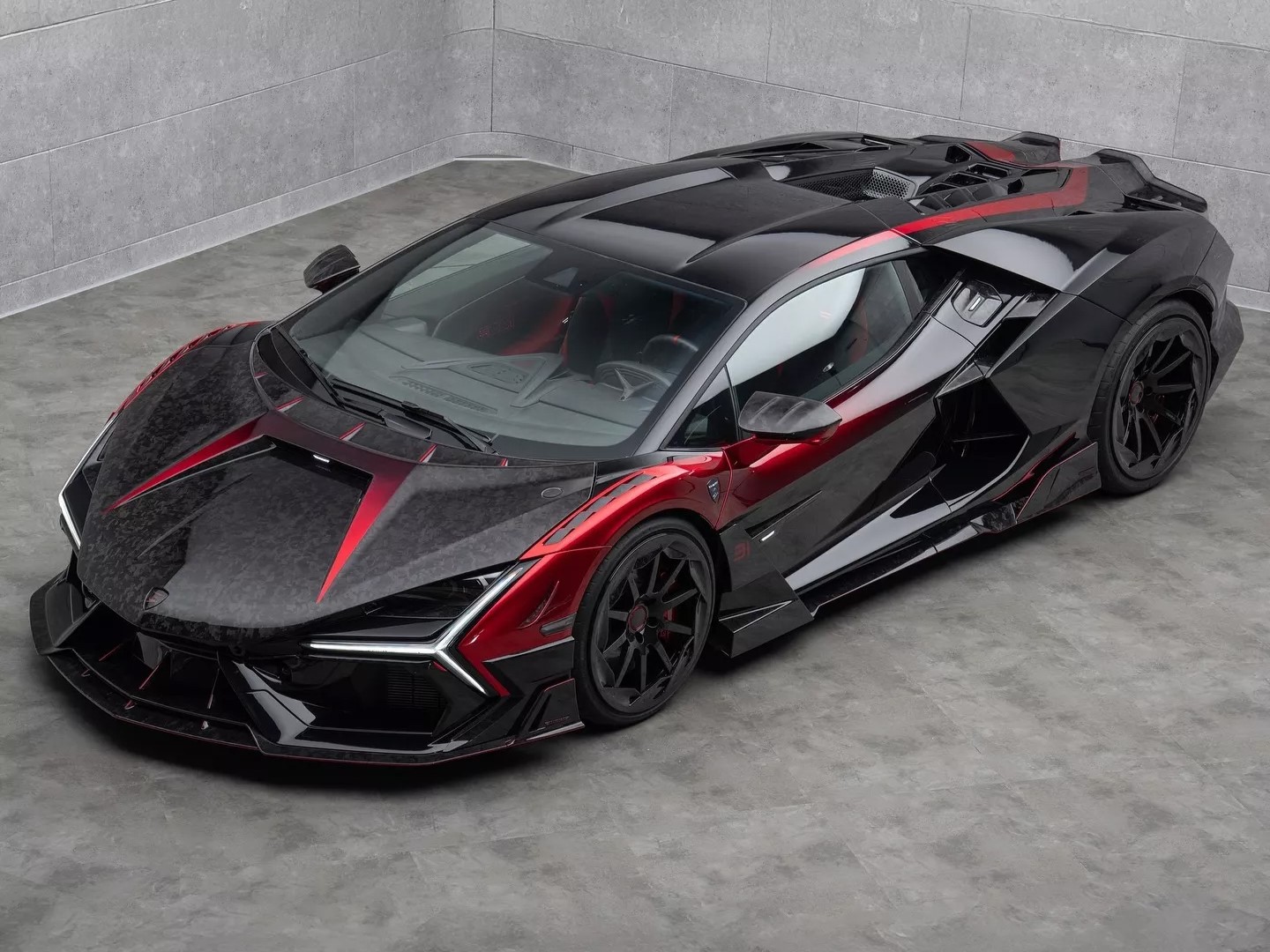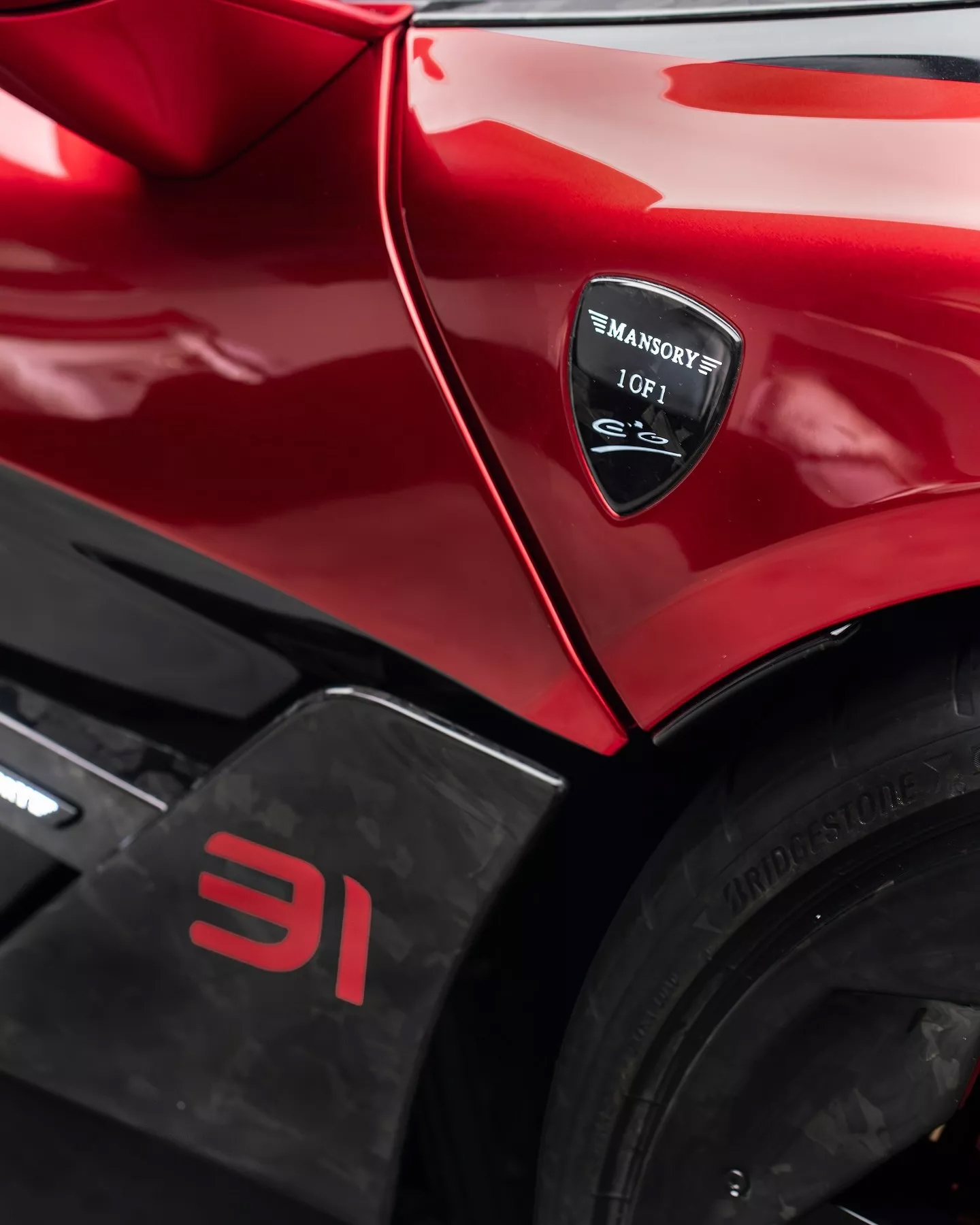 Ocon 所入手的這輛 Revuelto,幾乎徹底改頭換面。Mansory 將原廠的大部分鈑件換成鍛造碳纖維材質,並在前端打造專屬引擎蓋與全新前保桿,搭配更具侵略性的下擾流。車身主要以裸露鍛造碳纖維和亮黑色塗裝為主調,再以鮮紅色點綴於前葉子板、車門以及引擎蓋周圍線條,視覺張力更加強烈。車側換上重新設計的進氣孔與側裙,車尾則以固定式鍛造碳纖維尾翼取代原廠液壓尾翼,並追加更誇張的後擴散器,最後搭配一組造型複雜的專屬輪圈,徹底彰顯 Mansory 的獨特風格。