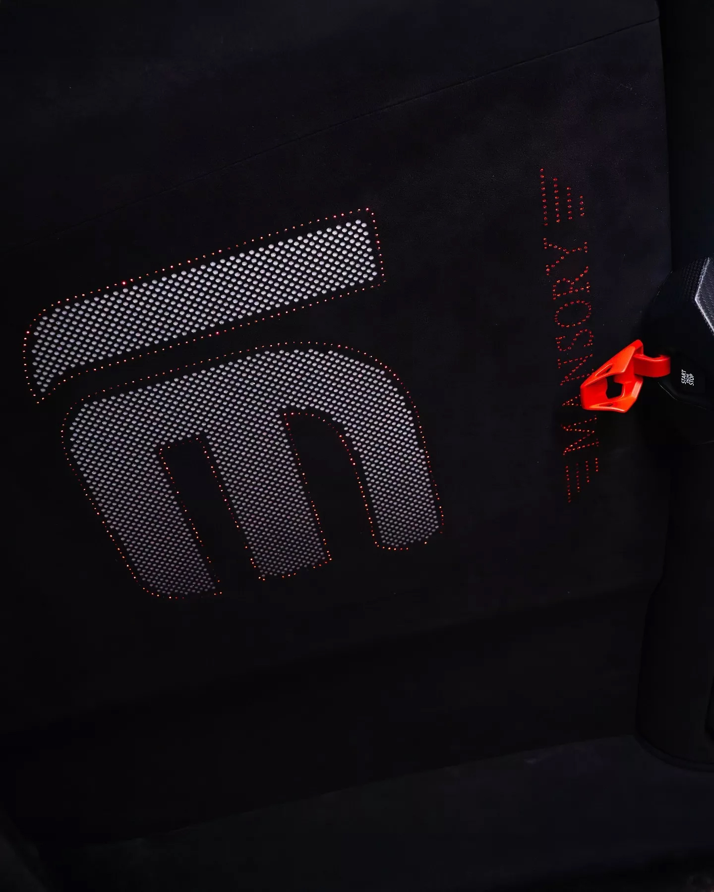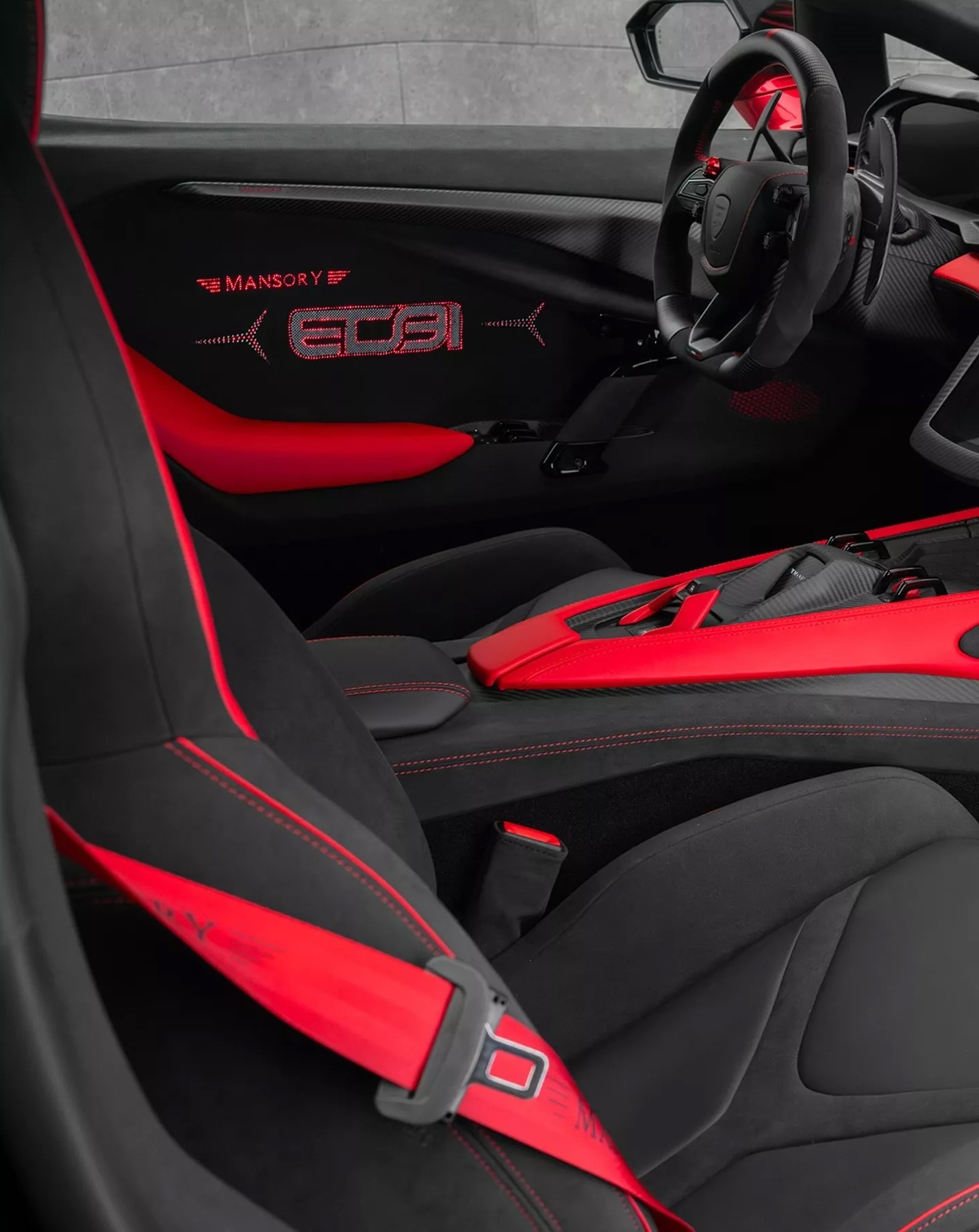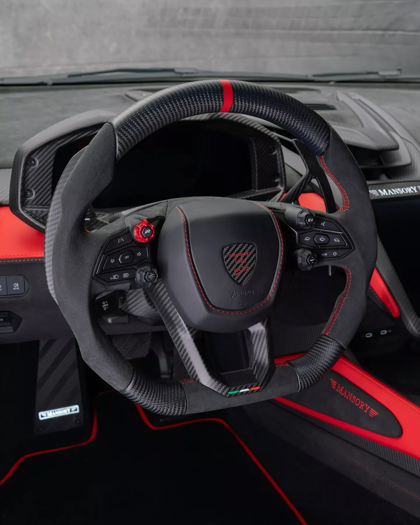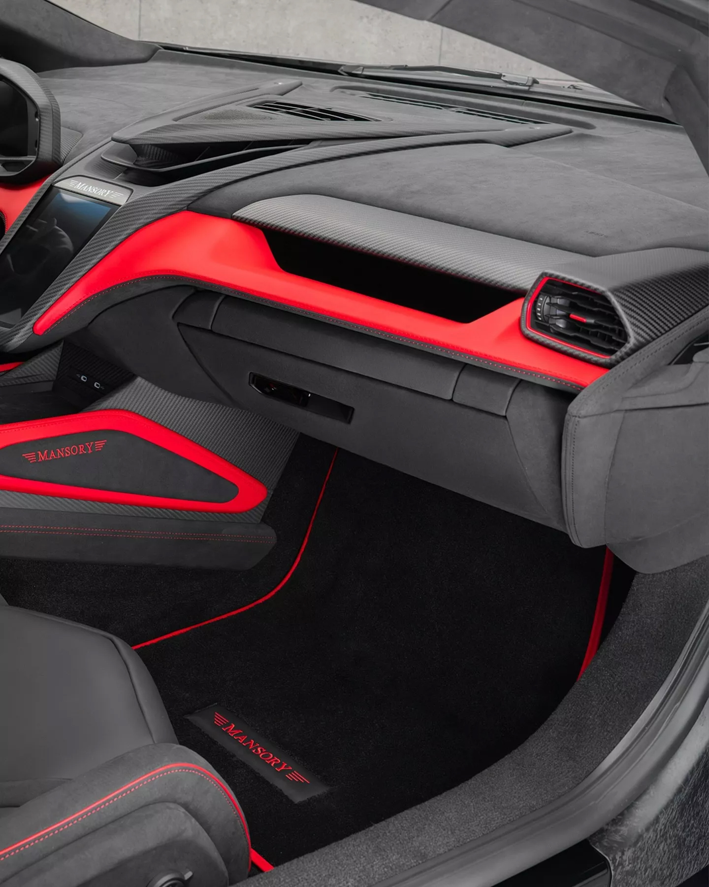內裝部分同樣呼應紅黑主題,大量紅色皮革覆蓋中控台與排檔鞍座,並換上紅色安全帶,而車門飾板與車頂更繡上 Ocon 的專屬標誌。特別的是,Mansory 將引擎 Start/Stop 啟動按鍵移至車頂,創造與原廠截然不同的操作體驗,為這輛 Revuelto 增添更多專屬細節。