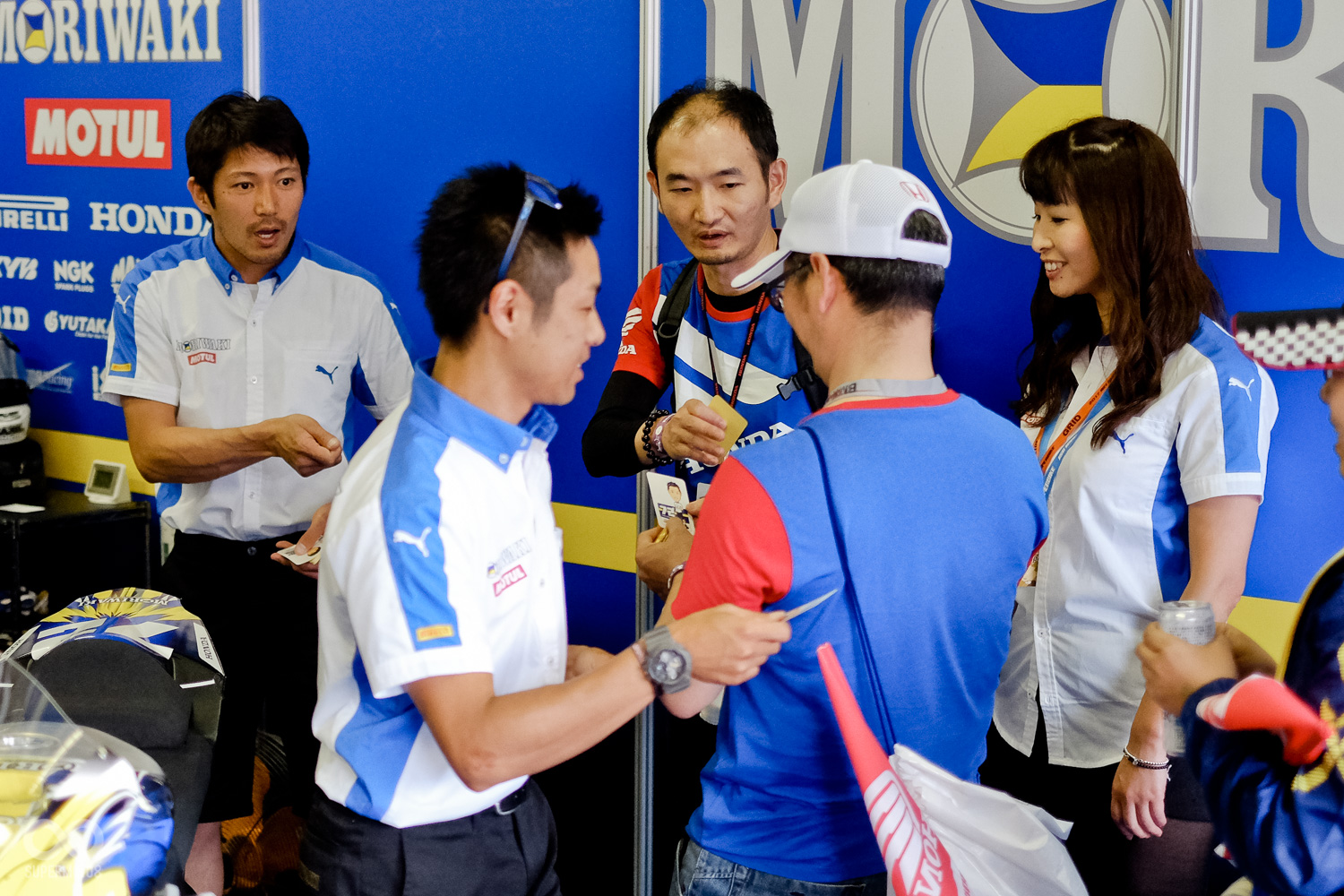 今天舉辦的是全日盃比賽,包含JSB1000、JGP2、ST600、以及JGP3 等賽事,本次安駕之旅的主辦單位HONDA Taiwan 還特別安排了所有團員到JSB1000 的MORIWAKI 車隊整備區,與該車隊選手清成龍一、高橋裕紀見面,機會十分難得!