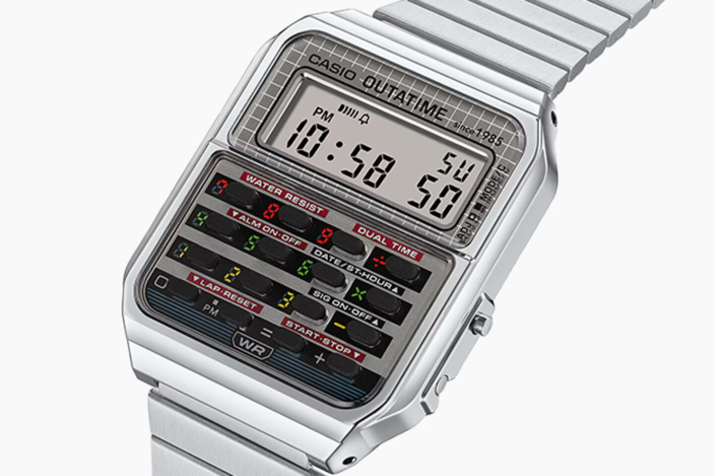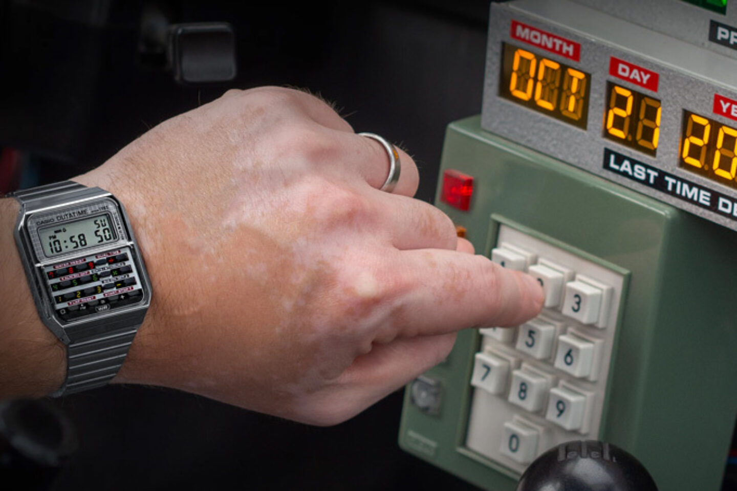 當時間旅行還無法實現時,最接近 1985 年的方法,或許就是戴上這支錶。為慶祝經典電影《Back to the Future》問世 40 週年,Casio 與電影官方推出聯名款 CA-500WEBF-1A 計算機手錶,以 Doc Brown 的 DeLorean 時光機儀表板 為靈感,復刻那段電子夢與懷舊交織的年代。