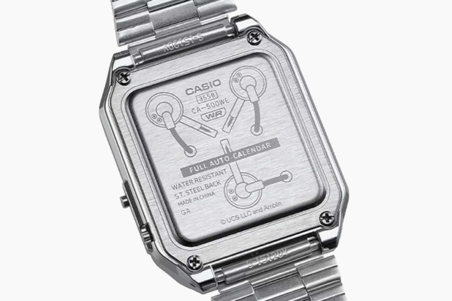 Casio 自 1980 年推出首款計算機錶 C-80 起,就成為 80 年代科技象徵。這次聯名款以 多彩按鍵設計 呼應電影中輸入時空日期的控制面板,紅、黃、綠三色按鍵排列重現「時間電路」畫面;螢幕上方印有經典車牌 “OUTATIME” 字樣,翻到背面則可見鐫刻的 Flux Capacitor(通量電容器) 圖案——那個讓時光機突破 88 英里、穿越時空的虛構能量核心。