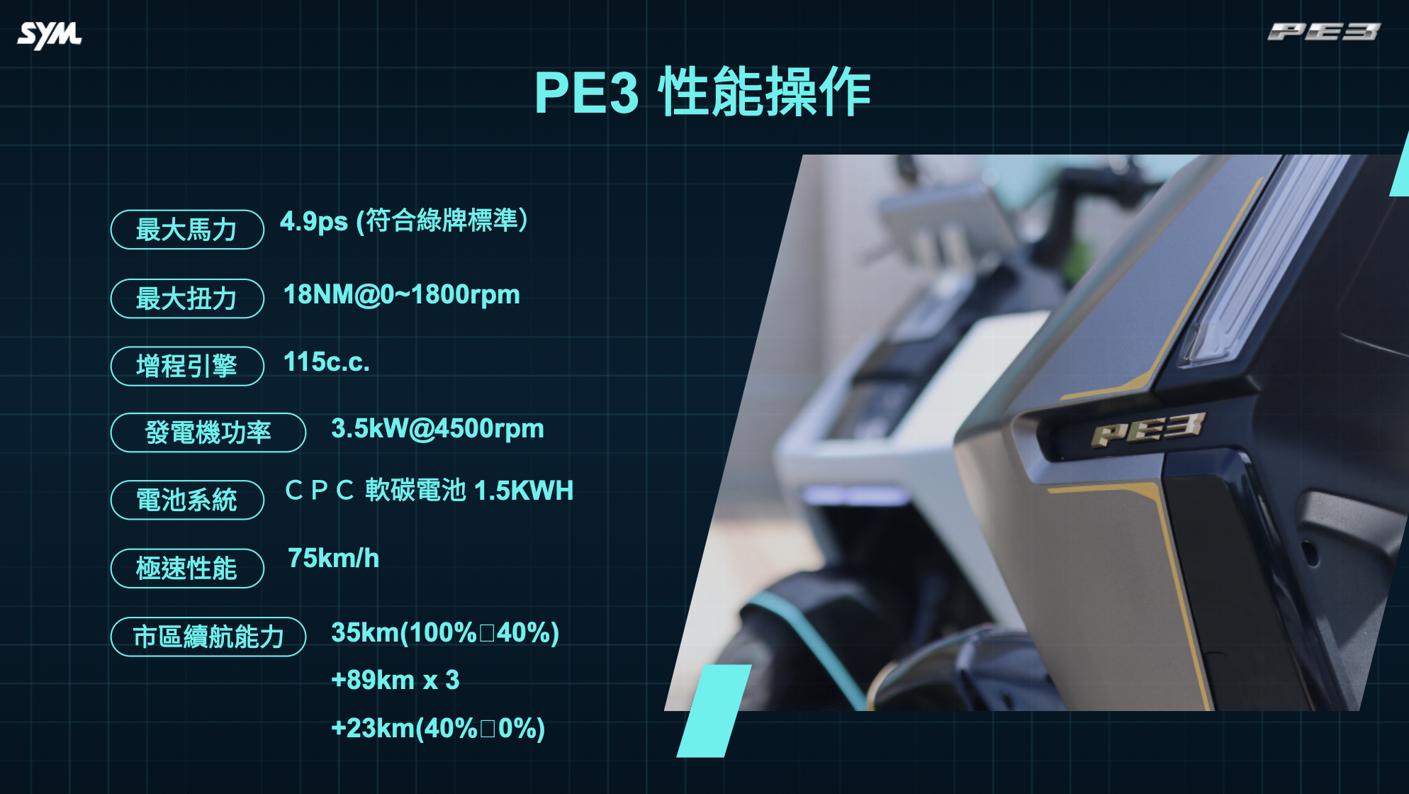 SYM 估算,在「以油發電+純電行駛」的雙模式運作下,PE3 的整體油耗比傳統燃油機車降低超過 50%,碳排放也同步減少一半。