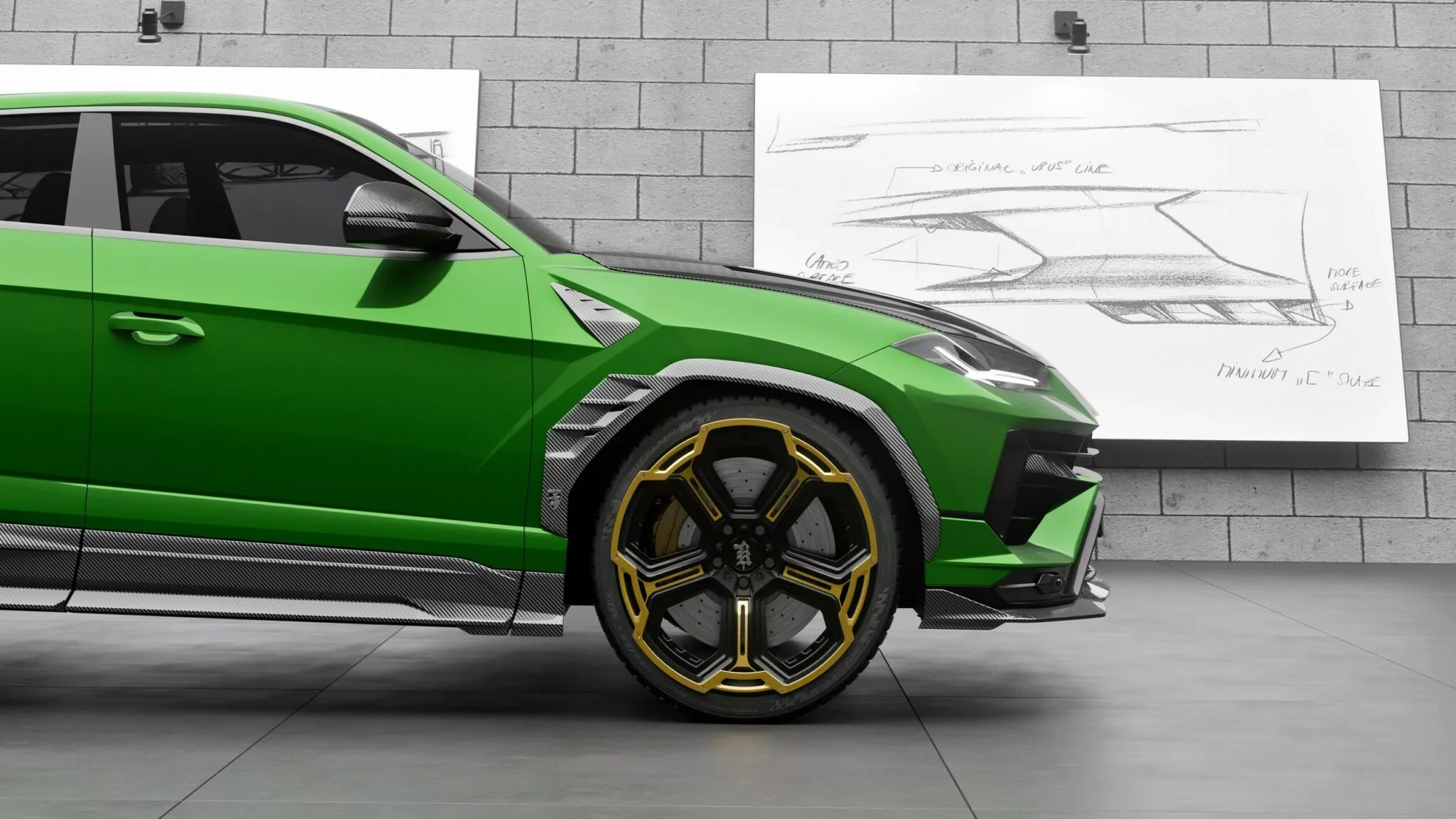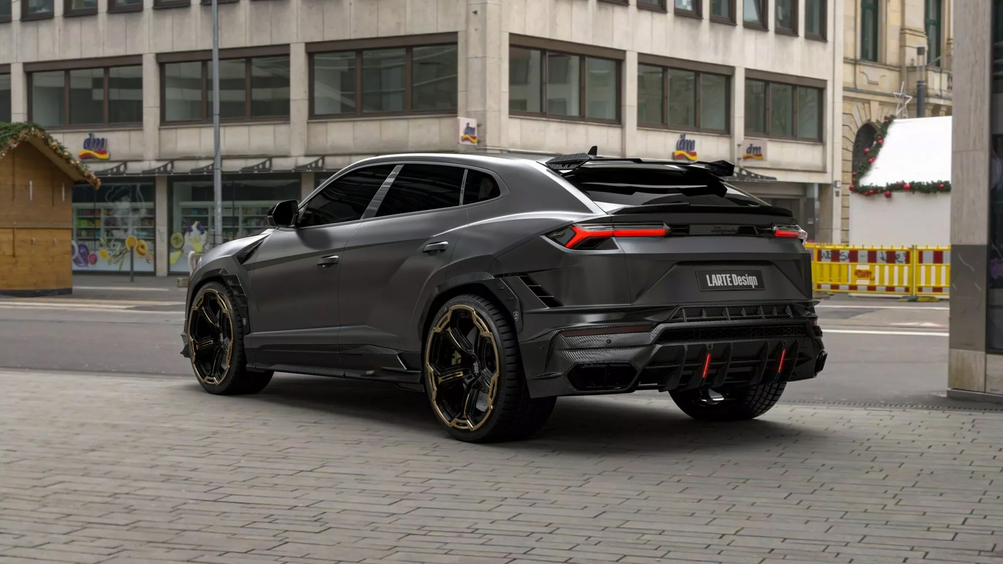 Larte 為 Urus 開發了多達 18 組全新外觀部件,幾乎重新塑造整台車的線條。最搶眼的莫過於裸露的碳纖維引擎蓋,搭配前下擾流與加寬的前輪拱,讓整個車頭更具戰鬥氣息。雖然整體設計張力十足,但前保桿造型仍保留一絲原廠比例的克制,沒有過度誇張的侵略性,展現出改裝品牌對美學平衡的掌握。