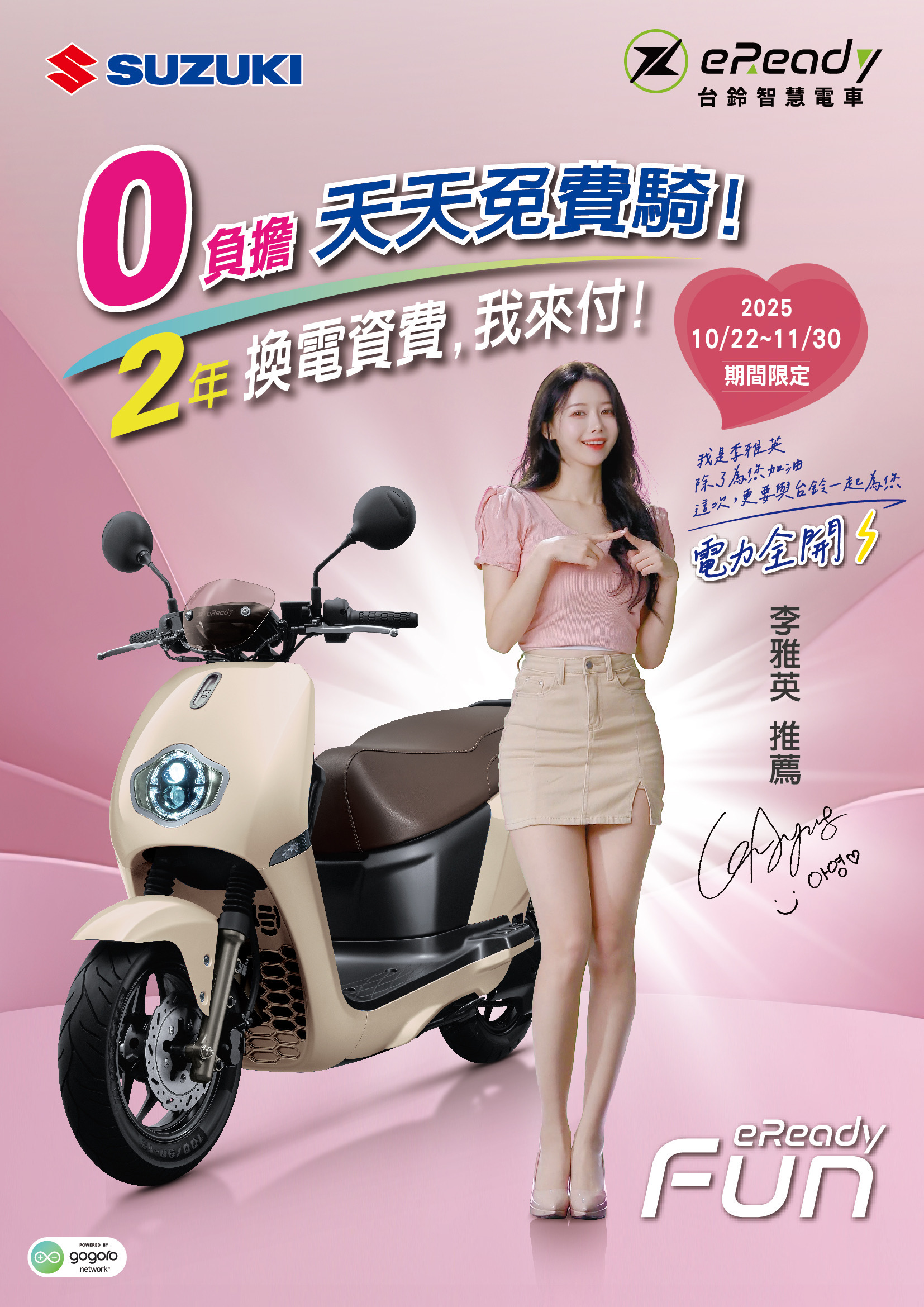 eReady 看準李雅英在年輕族群中的高人氣,強強聯手推出限時優惠專案「eReady 電力全開」,只要購車,即享 2 年換電資費由 eReady 全額買單!活動限量進行至 2025 年 11 月 30 日止。