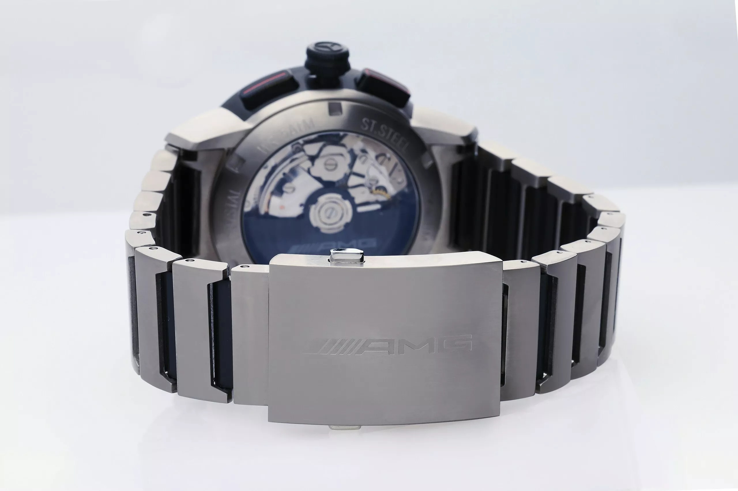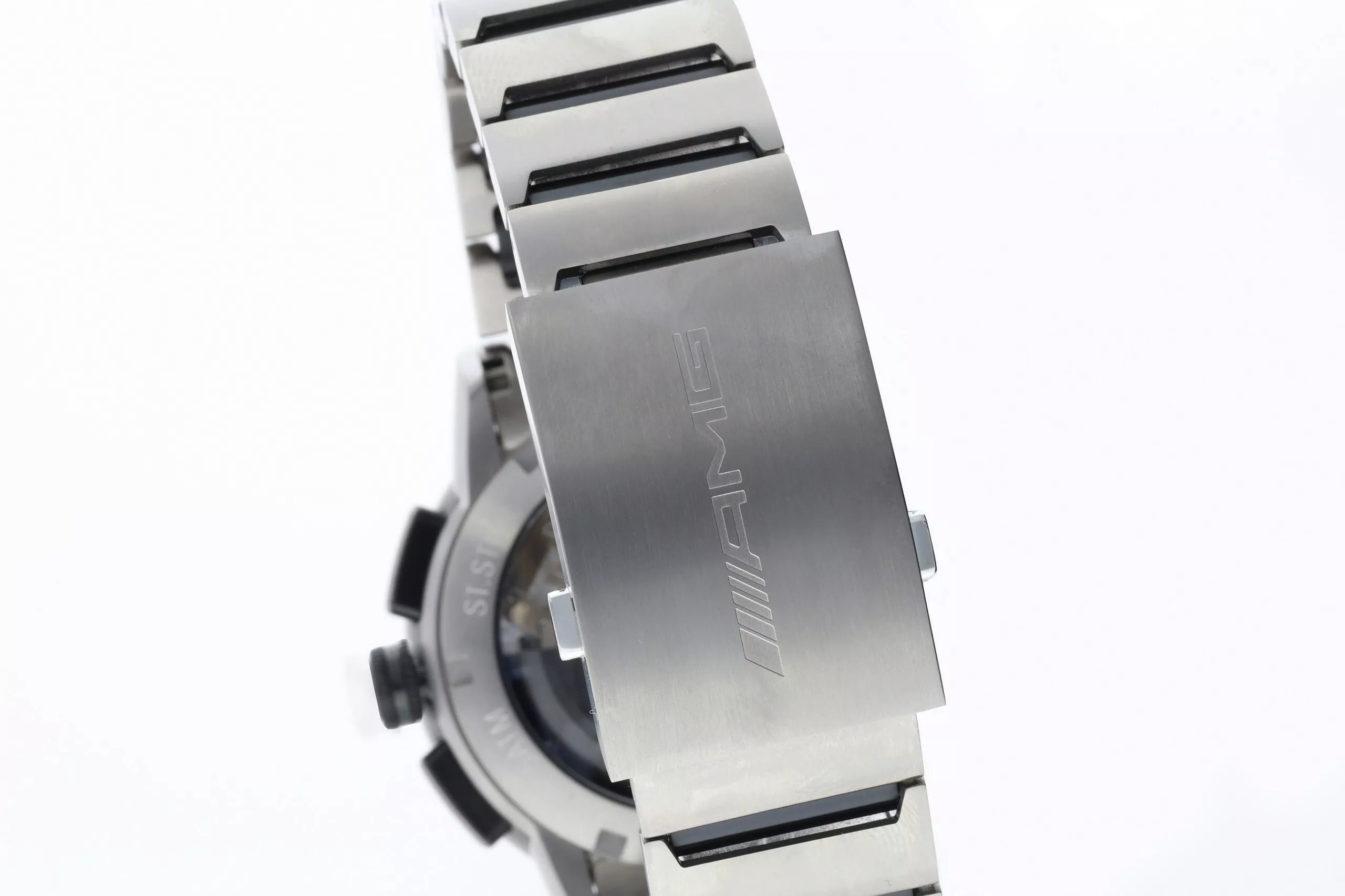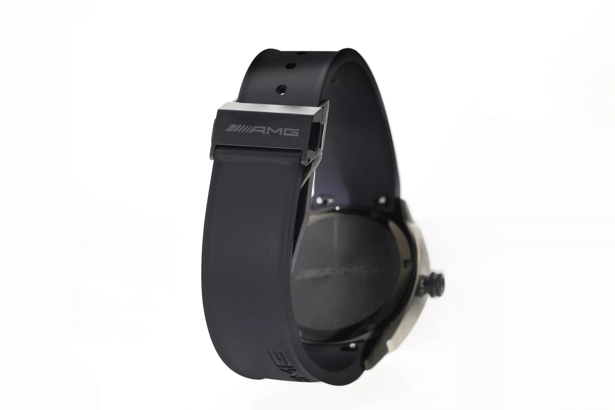 錶徑為43.5mm,錶身由鈦金屬打造,不僅輕盈且具備出色的耐腐蝕特性。正面則以藍寶石水晶鏡面保護錶面,整體具備5 ATM(50米)防水等級。細節部分加入紅色指針與刻度點綴,呼應AMG高性能車系的設計語言,小巧而精緻的AMG標誌則低調印於錶面,僅為識者所知。
