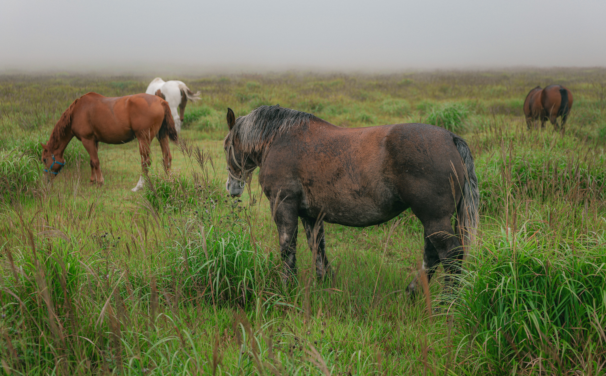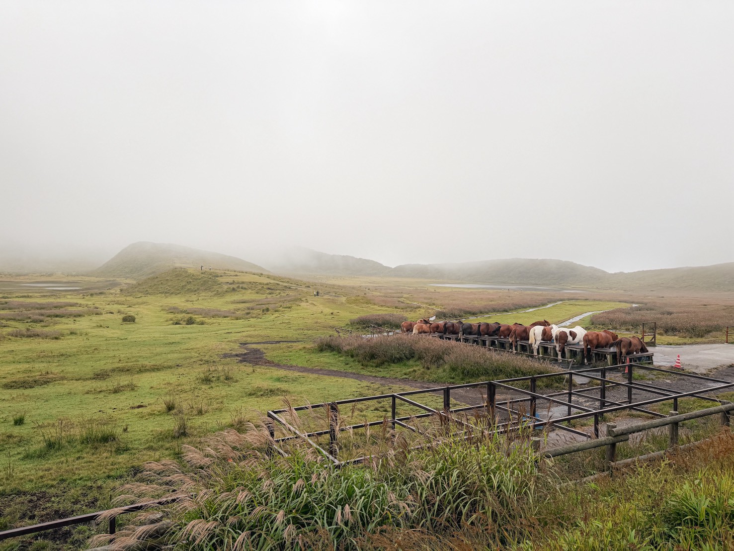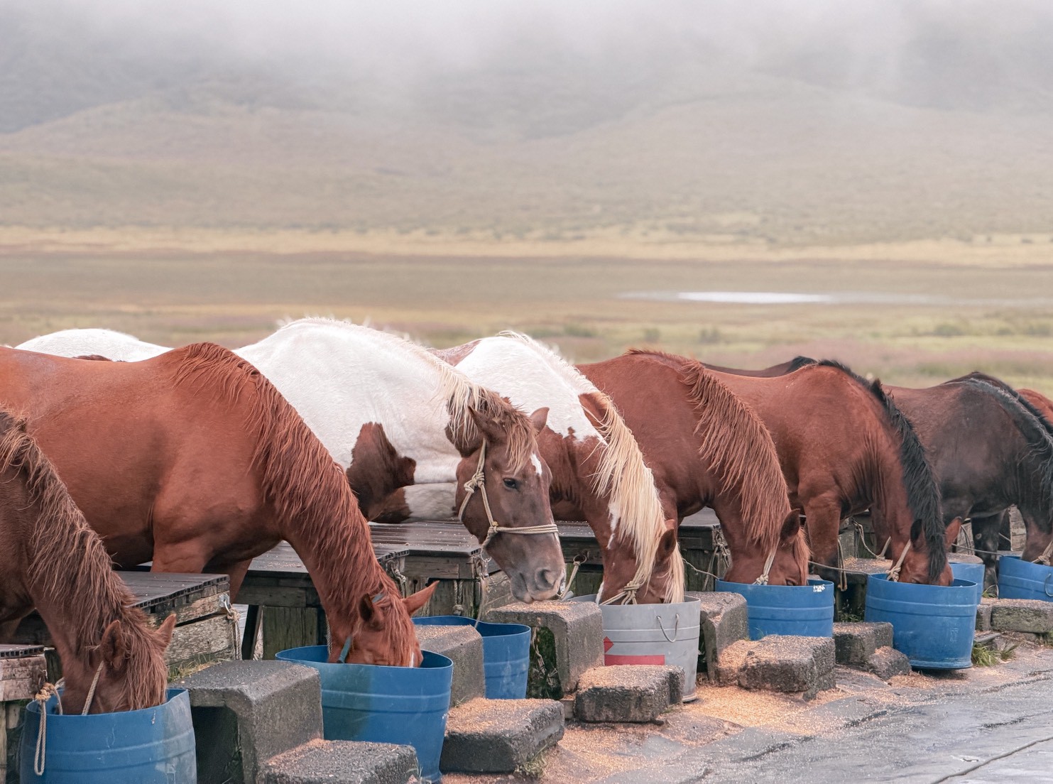 這裡有一個超廣闊的大平原,重點是,這裡放養了超多馬匹!雖然當地以馬肉聞名,但這些馬超可愛、超溫馴。那天剛好起大霧,看不清平原的盡頭。當馬匹吃完飼料,緩緩地走入雲霧深處時,那畫面超魔幻、超治癒!