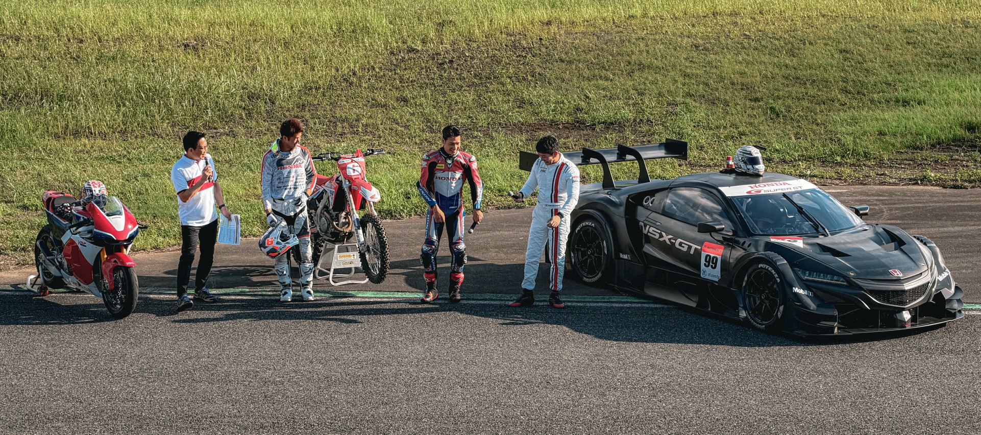 最熱血的表演莫過於賽道上的追逐秀!現場邀請了 F1 車手、MotoGP 車手中上貴晶,以及越野車冠軍。F1 賽車和 MotoGP 廠車的巨大聲浪震耳欲聾,他們在賽道上互相追逐,越野車手則在跳台上飛躍,那種氣勢與速度的饗宴,讓人再次感受到 Honda 作為全球二輪最強品牌的霸氣!