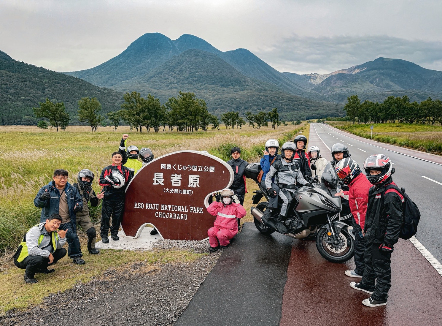 騎車上路,雖然一開始有點狼狽,但當來到九重國立公園那開闊的景色時,所有疲憊都一掃而空。那畫面太震撼了!平坦的草原、遠方的火山冒著煙,簡直就像是「巨大化版本的陽明山」,又有點像置身非洲大草原的野性。那筆直的道路,簡直是騎士們的天堂,所有團員都在那邊停下來瘋狂拍照打卡,整個氣氛瞬間被炒到最高點!