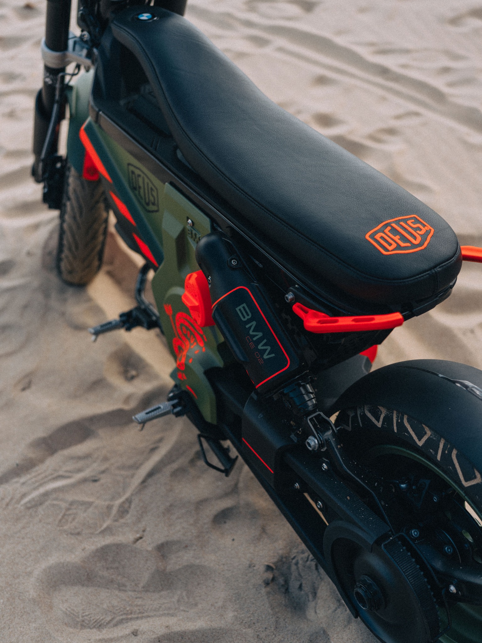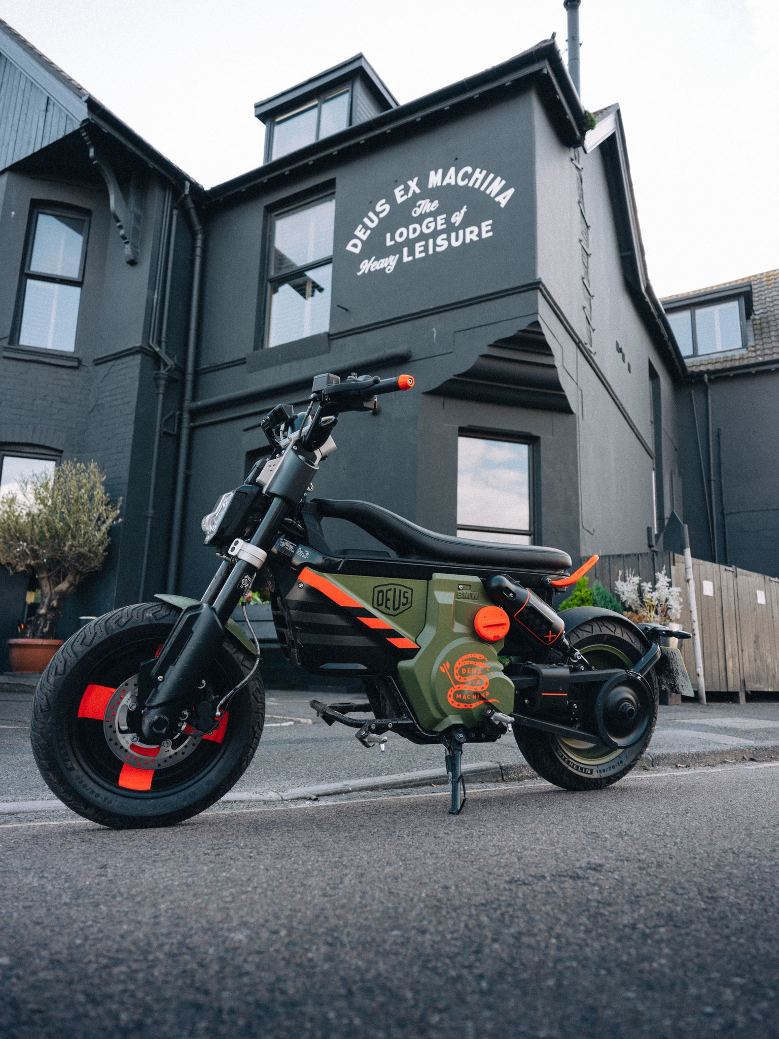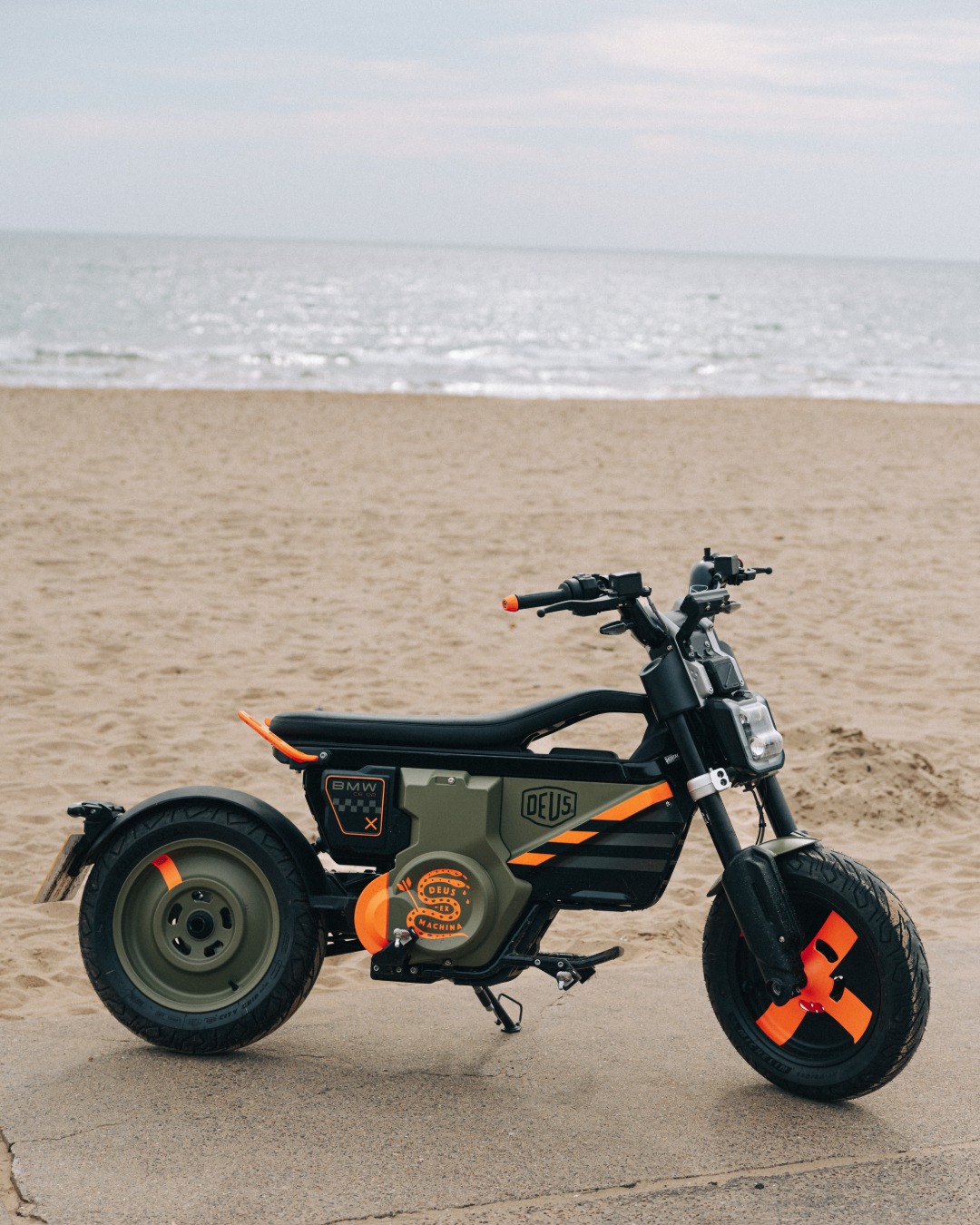 這座被稱為「重度休閒之館」的 Deus Lodge,是 Deus 在英國的海邊基地,自 2023 年開幕以來就成為當地潮流聚落的文化中心。這次聯名的客製 CE 02 以 Lodge 的色調與 Deus 經典設計語彙為主軸,結合 BMW 的都會電動科技,讓它既能在街頭穿梭,也能輕鬆前往海灘。