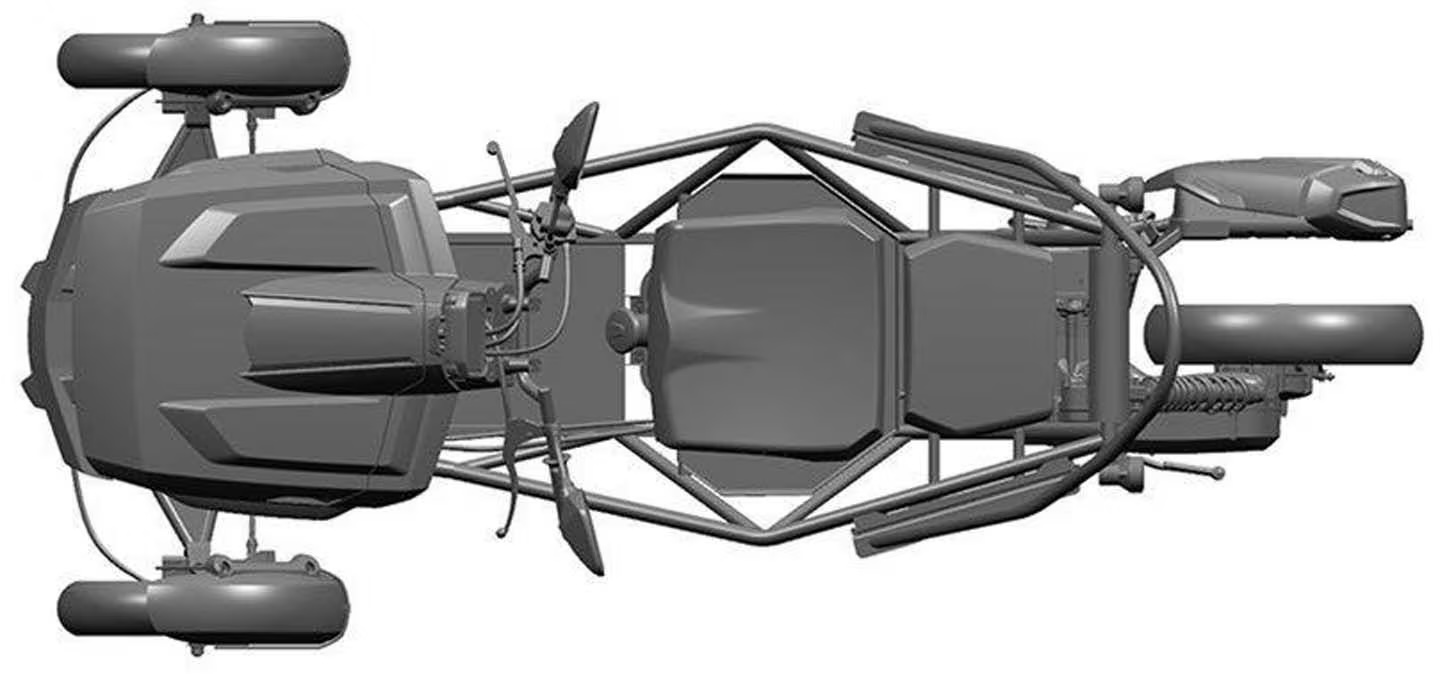 從公開的設計圖可見,這款三輪車的工程設計徹底遵循了低成本原則。車身採用簡潔的三角形鋼管骨架,前輪為單 A 字臂結構,樞軸靠近車身中線。避震系統由兩組 Coil-over 減震器支撐,頂部連接至一個中央可動的橫桿,使得車身主體在過彎時能夠向內傾斜,而前輪胎面則盡可能保持有效的接地。