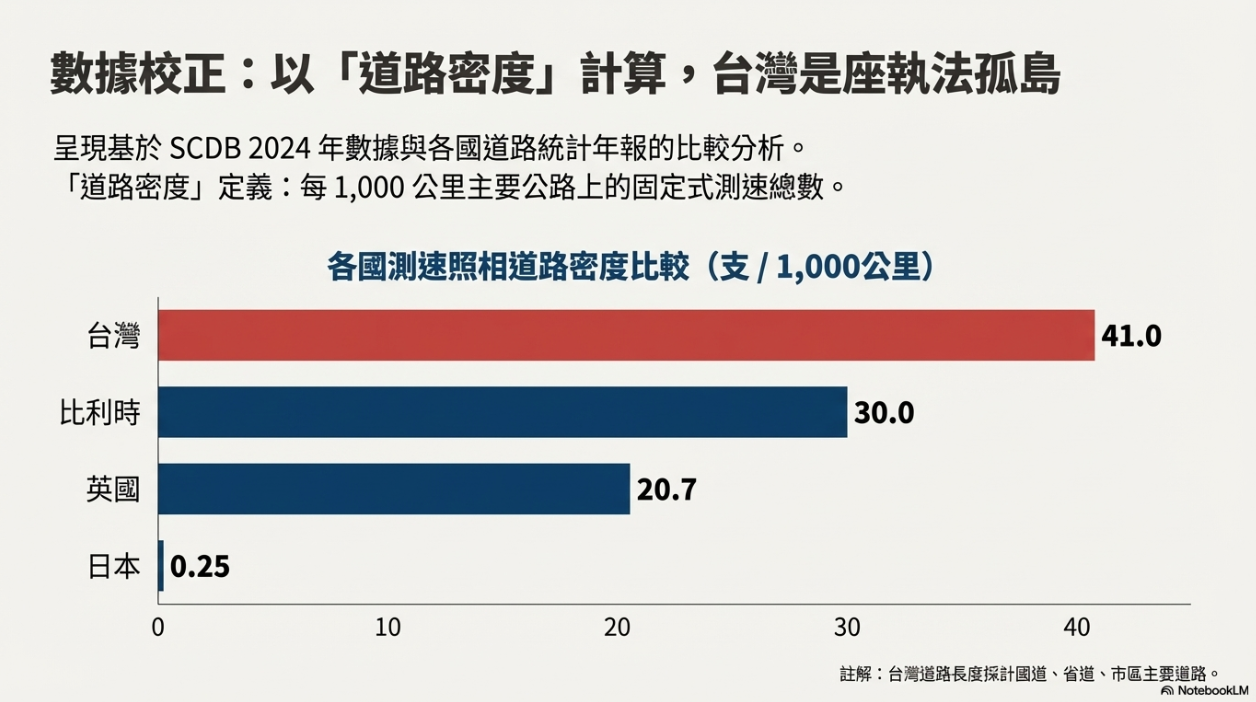 台日差距確實存在: 台灣的道路執法密度約為日本的 164 倍。足以證明兩國採取了截然不同的治理邏輯。
