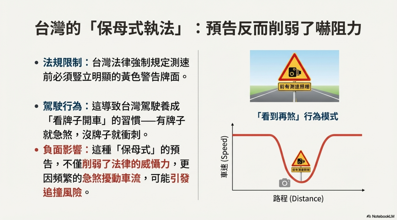 對比台灣: 台灣法律強制規定測速前必須豎立明顯黃色牌面。這導致台灣駕駛養成了「看牌子開車」的習慣——有牌子就煞車,沒牌子就衝刺。這種「保母式」的執法預告,反而削弱了法律的威攝力,並造成車流因急煞而擾動。