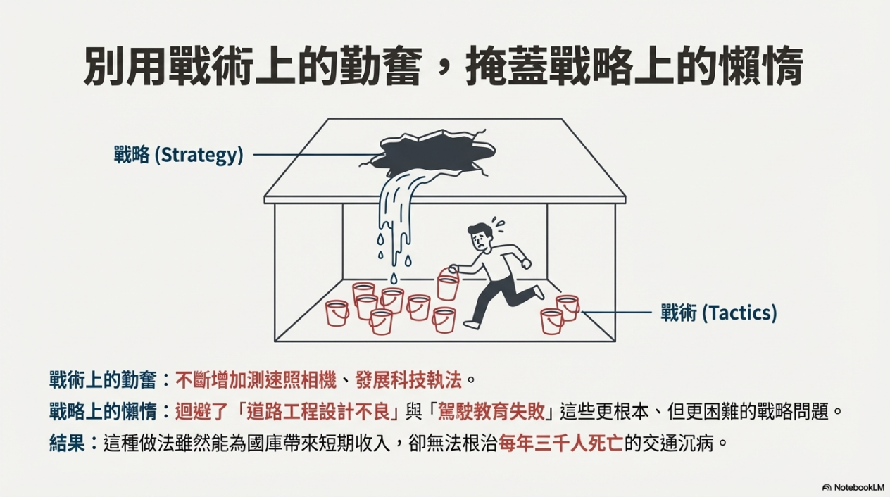政府試圖用大量的「科技執法(戰術)」來彌補「道路工程設計不良(戰略)」與「駕駛教育失敗(根本)」的漏洞。這種做法雖然能為國庫帶來短期收入,卻無法根治每年三千人死亡的交通沈痾。