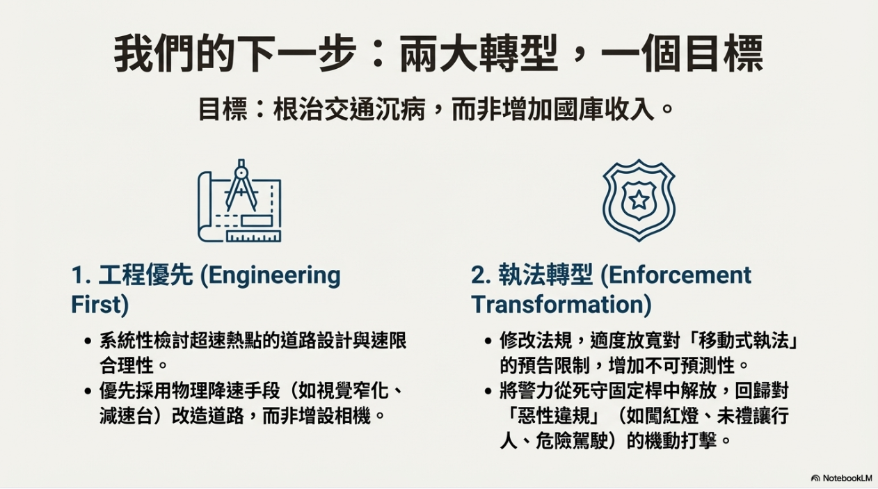 執法轉型: 修改法規,適度放寬對「移動式執法」的預告限制,讓警力回歸對「惡性違規」(如闖紅燈、未禮讓、蛇行)的機動打擊,而非死守固定桿。
