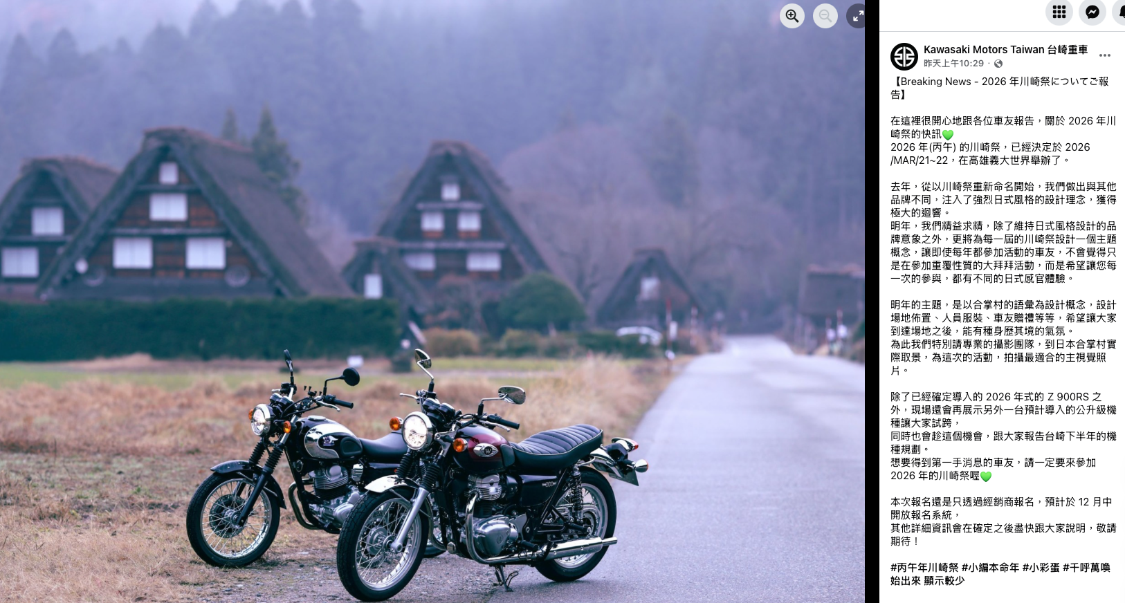 川崎車主們請注意!台崎重車(Kawasaki Taiwan)正式宣布 2026 年川崎祭 將於 3 月 21 日至 22 日 在 高雄義大世界 盛大舉辦。為避免流於形式,官方今年定調「合掌村」主題,甚至遠赴日本實地取景拍攝主視覺,屆時從場地佈置到體驗都將充滿濃厚的日式風情,讓車友宛如置身日本岐阜縣。
