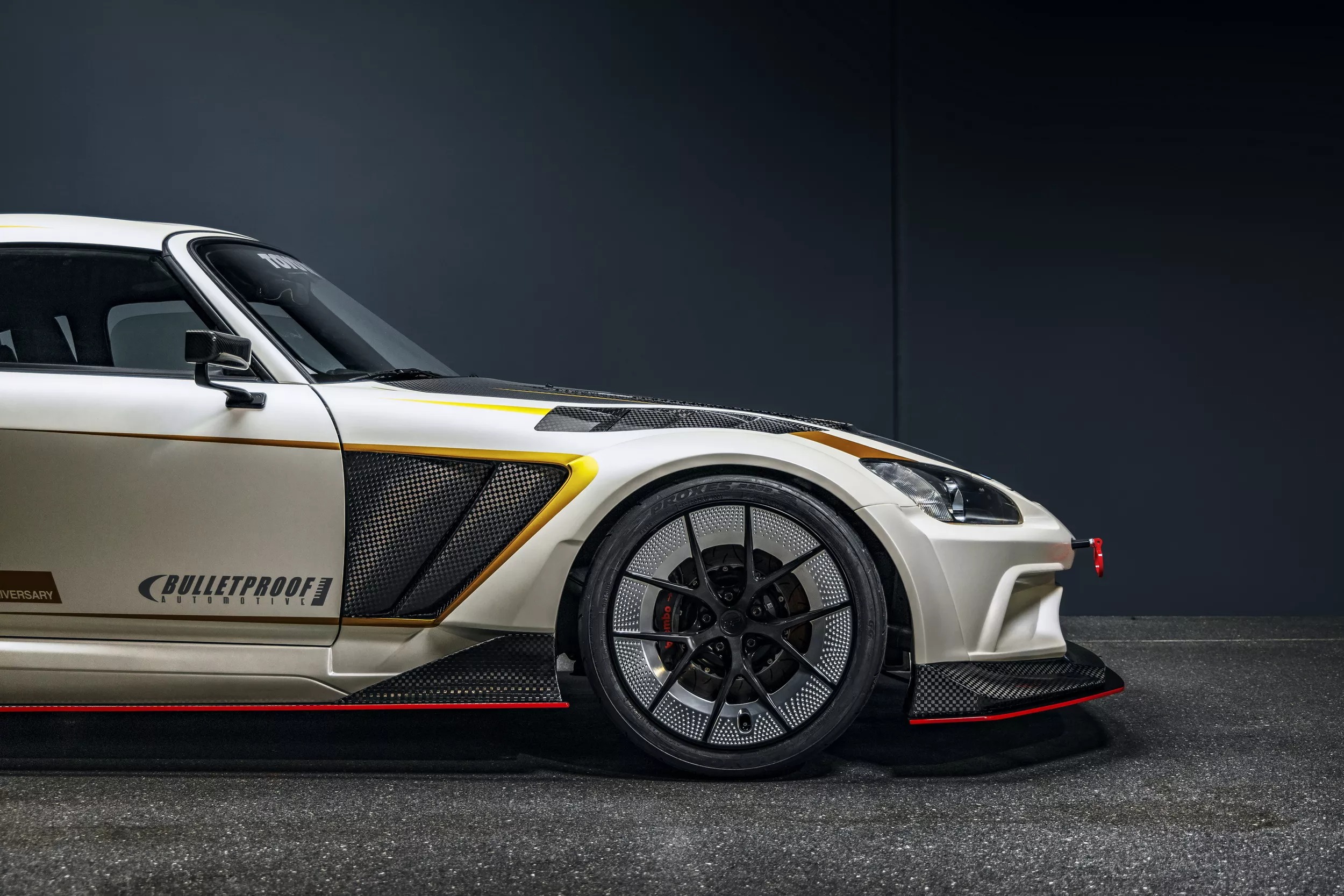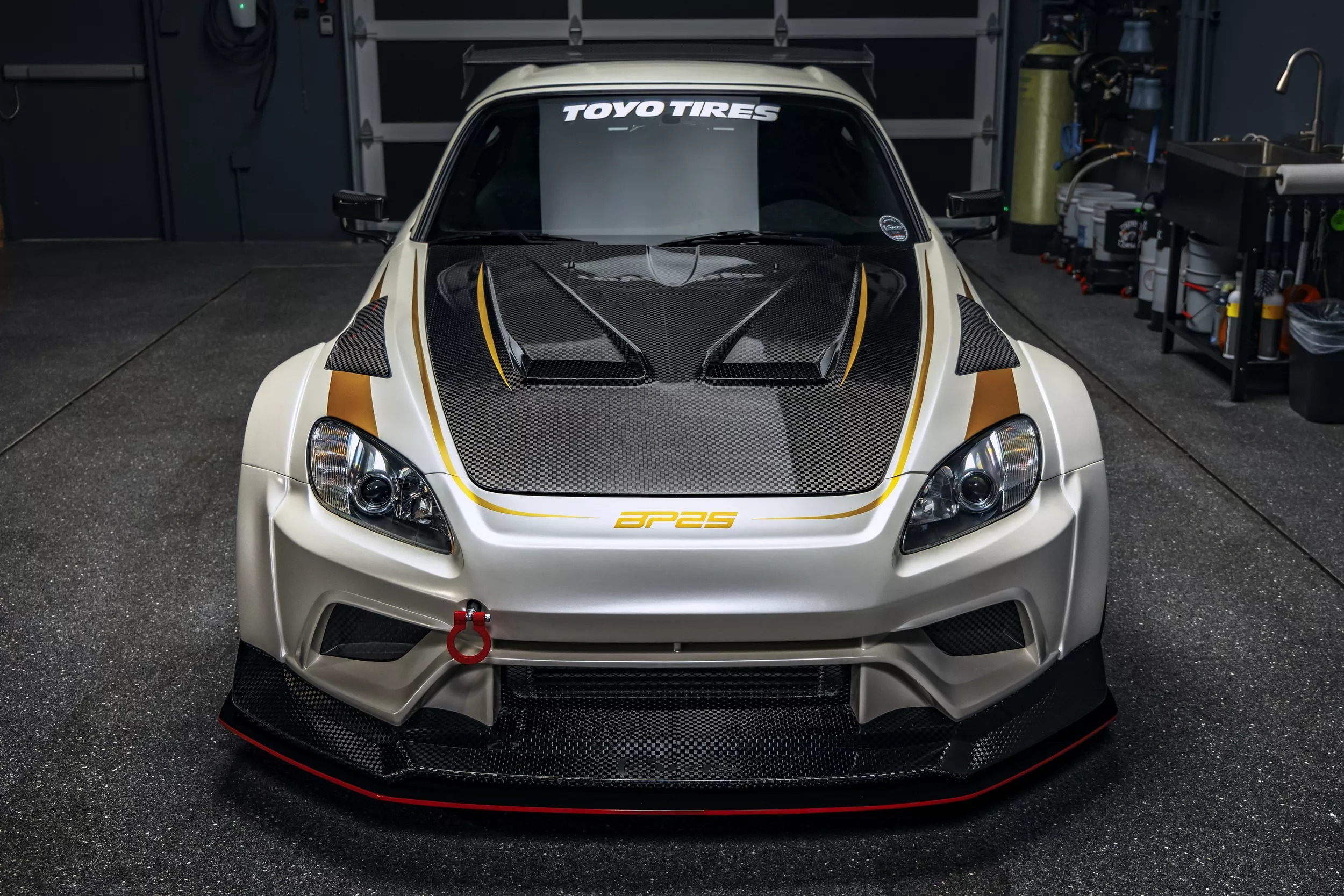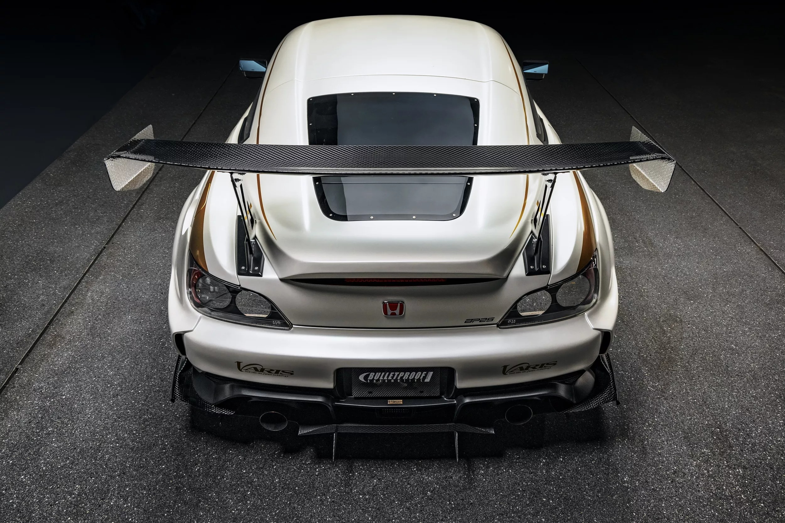 Bulletproof Automotive為慶祝創立25週年,決定以S2000為基礎,打造一輛象徵日系改裝文化精神的代表之作。這輛BP25不再是原廠的開篷設定,而是經過重新設計成為硬頂雙門跑車。它採用了Spoon Sports硬頂結構,外觀則換上由Varis推出的Dark Panther碳纖維寬體空力套件,包括重新設計的前後保桿、更寬的葉子板、進氣口與擾流通風口,以及巨大的尾翼結構。整車以Lamborghini Balloon White(氣球白)為主色,點綴金色拉花與外露碳纖維部件,搭配紅色細節塗裝,營造出極具侵略感的視覺張力。