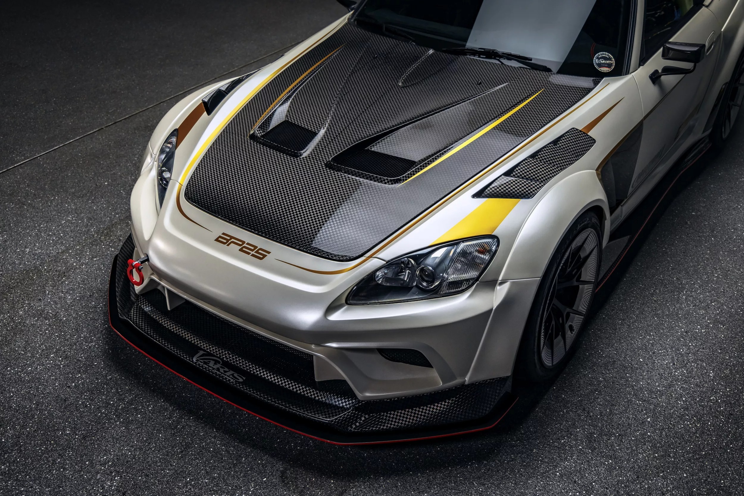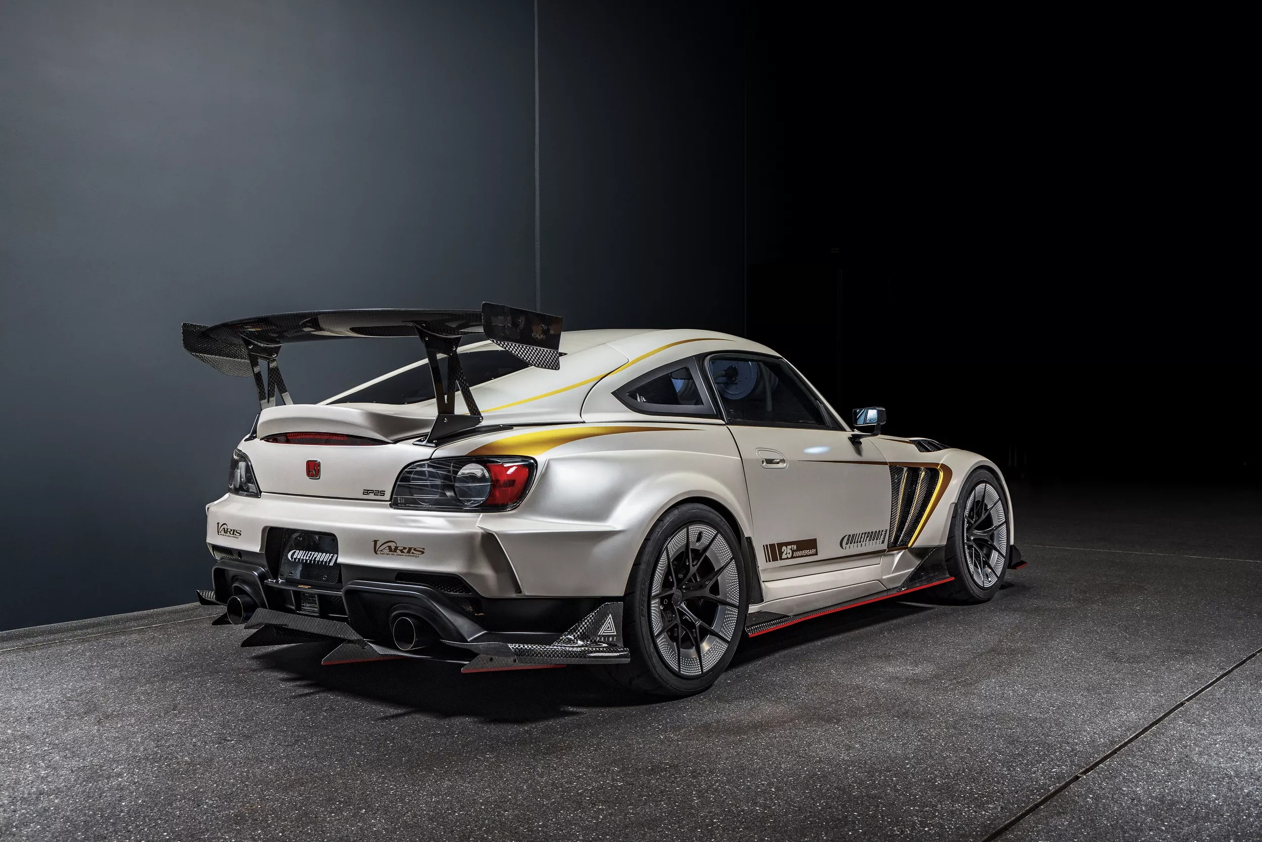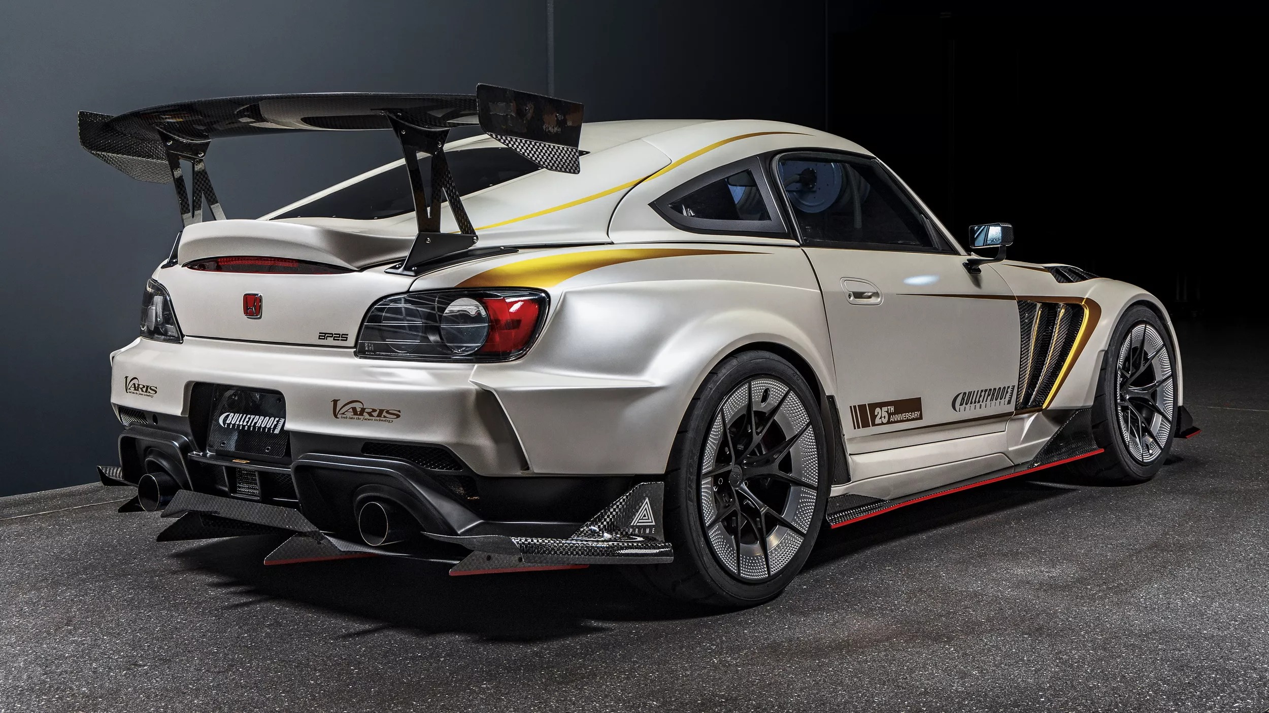 Bulletproof Automotive為慶祝創立25週年,決定以S2000為基礎,打造一輛象徵日系改裝文化精神的代表之作。這輛BP25不再是原廠的開篷設定,而是經過重新設計成為硬頂雙門跑車。它採用了Spoon Sports硬頂結構,外觀則換上由Varis推出的Dark Panther碳纖維寬體空力套件,包括重新設計的前後保桿、更寬的葉子板、進氣口與擾流通風口,以及巨大的尾翼結構。整車以Lamborghini Balloon White(氣球白)為主色,點綴金色拉花與外露碳纖維部件,搭配紅色細節塗裝,營造出極具侵略感的視覺張力。