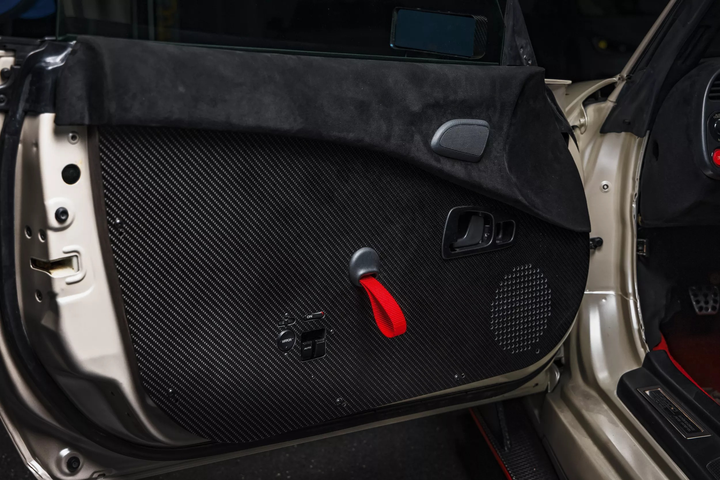 車艙內部同樣保留濃厚的賽車氛圍。方向盤採用Mugen麂皮包覆設計,搭配Recaro RS-G賽車座椅與多點式安全帶;排檔桿為ARC鈦合金製作,中央還嵌入NSX-R專屬喇叭按鈕,細節致敬本田性能家族的傳統。整體內裝以Alcantara與紅色縫線點綴,並加裝防滾籠以強化剛性與安全。