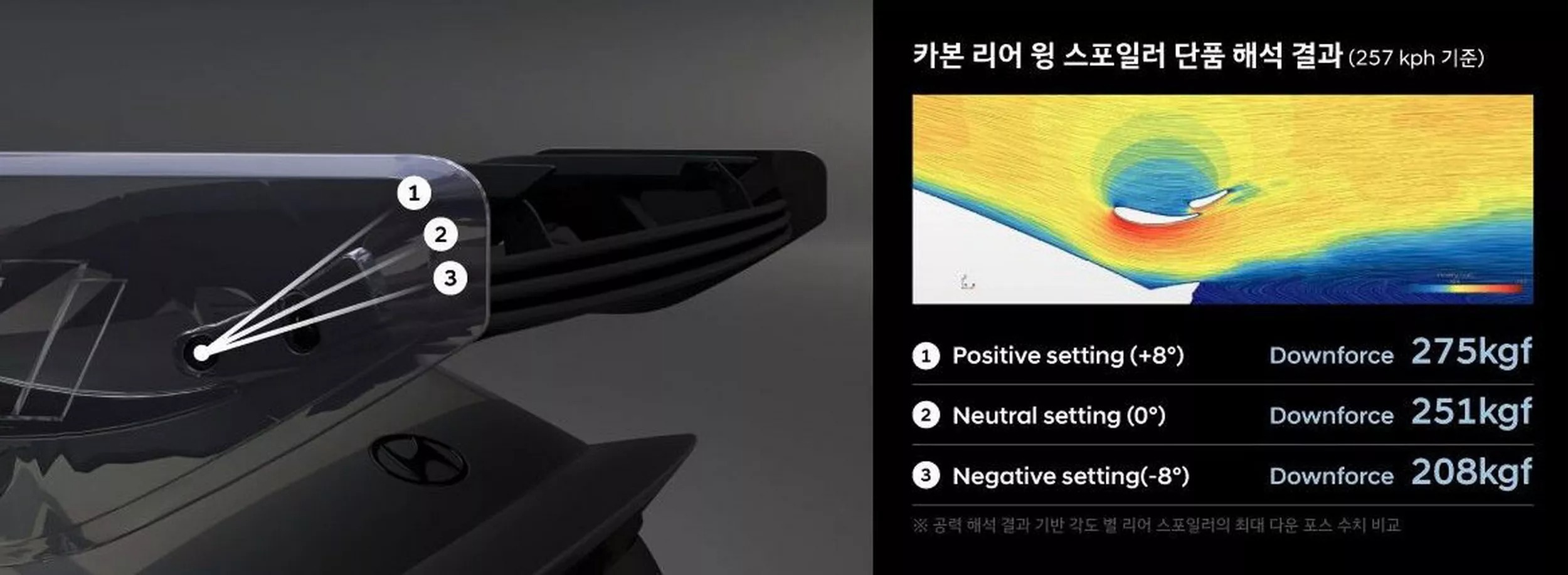 這支尾翼不僅僅是裝飾,它能提供三段可調角度:+8°、0°與-8°,在時速257 km/h下可產生265至305公斤的下壓力。為進一步平衡氣流,Hyundai還在車底增設導流板,於極速時額外提供16公斤的下壓力,使車輛在高速過彎與煞車時更穩定。整套空力套件採用裸露碳纖維結構,與車身下方經典的紅色飾條形成鮮明對比。這些視覺細節讓Ioniq 6 N的外觀更加戰鬥,彷彿隨時準備進入賽道。