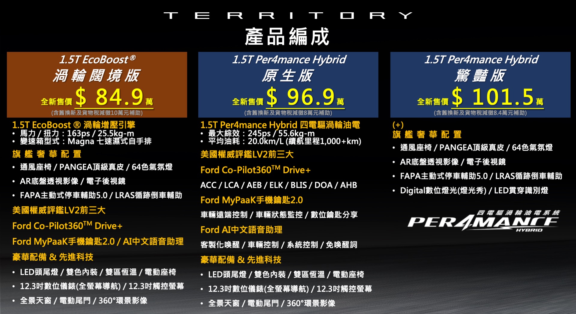Ford全球中型休旅級距的全新力作:The All-New Ford Territory,如原廠工程開發部副總Eric Hermann所述,該車集結Ford對於家用休旅應該擁有「性能、空間、科技、個性」的全新想像,滿足消費者全方位的要望;並在全球五大洲、超過80個市場佈局陸續上市,開啟驚豔全球的休旅新紀元。福特六和正式宣布The All-New Ford Territory在台上市,本次提供1.5T Per4mance Hybrid四電驅渦輪油電及1.5T汽油渦輪雙動力,全車系共三車型,正式售價84.9萬起(含舊換新及貨物稅減徵補助),並於2025年底前入主享價值超過8萬的四大早鳥好禮,包含5年原廠保固〔註一〕、3年內建導航圖資更新、3年MyPaaK手機鑰匙2.0服務,以及專屬行李艙旗艦套件。The All-New Ford Territory於12月13日起全國全面展開試駕體驗,敬邀消費者即刻預約試駕,刷新每一次驚豔!