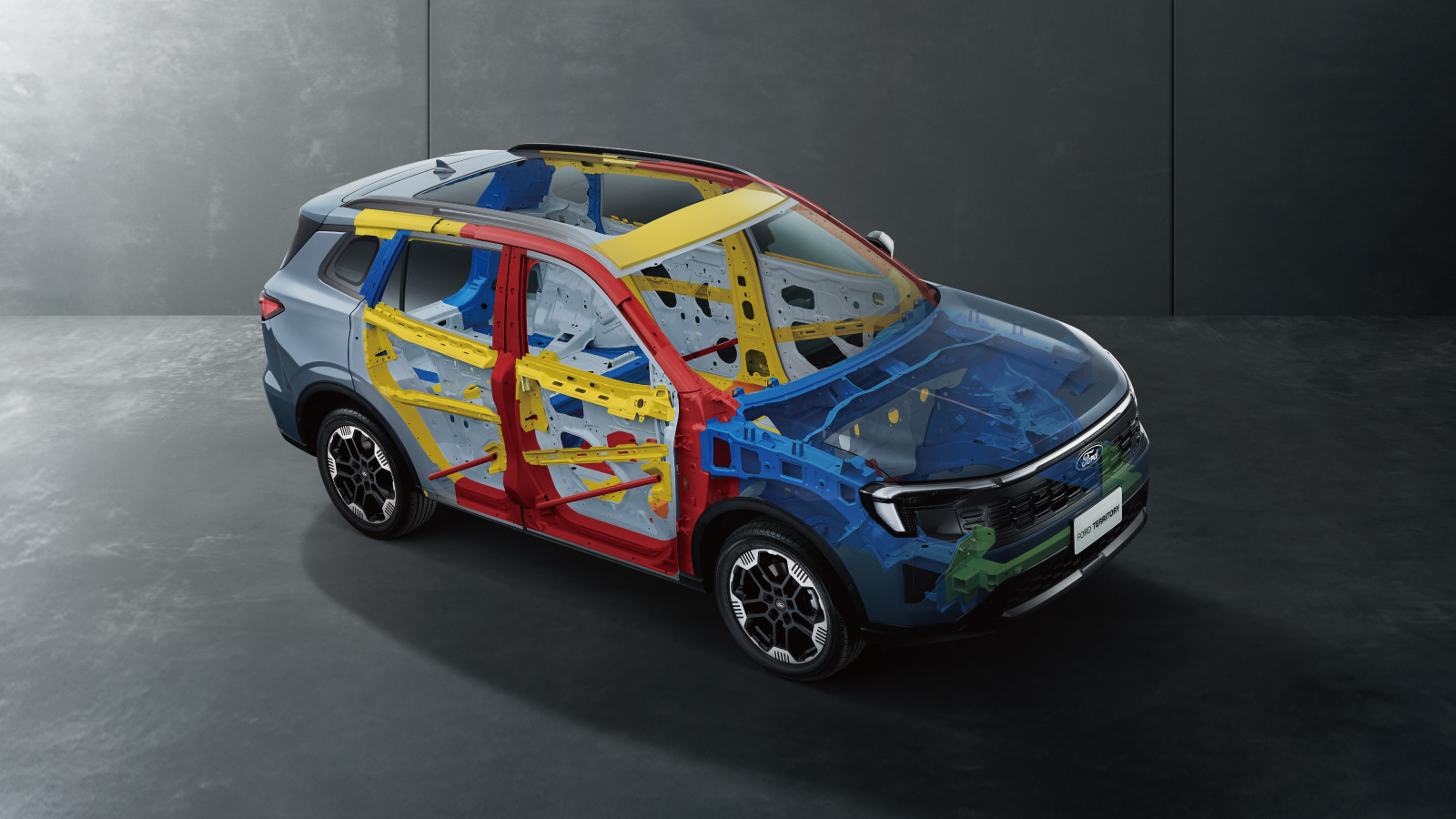 The All-New Ford Territory作為全球戰略車款,始終堅持安全、耐久與動態穩定。全車採用超過65%超高強度鋼材,最高達1,500MPa高強度硼鋼,搭配「八橫六縱」鋼骨工藝與360⁰環形結構,築起堅實安全堡壘。A柱至B柱採用高強度硼鋼,門框採熱成型高強度一體式設計,並結合航空級鋁擠型前防撞樑,優化撞擊能量傳散。同時透過雷射焊接與整體熱成型技術,車身剛性與抗扭曲性大幅提升,不論極端路況,始終穩健守護。同時整車通過Ford PASCAR嚴苛測試(模擬10年24萬公里)及Ford Trust-MarkTM全球標準認證,確保長年使用依然維持舒適與穩定,以及Ford不容妥協的動態穩定性的要求。