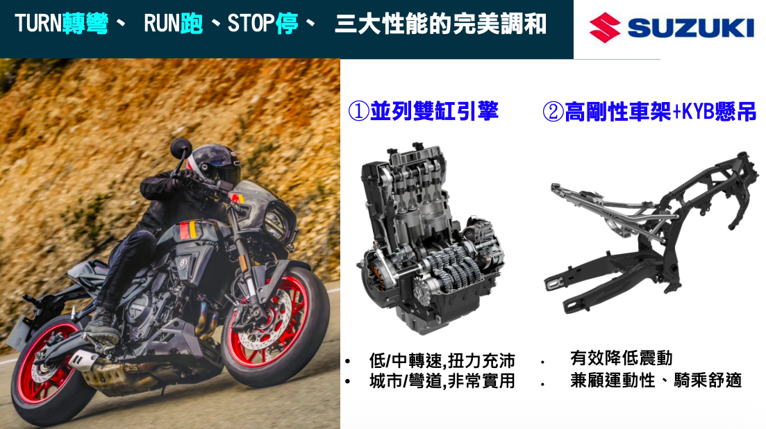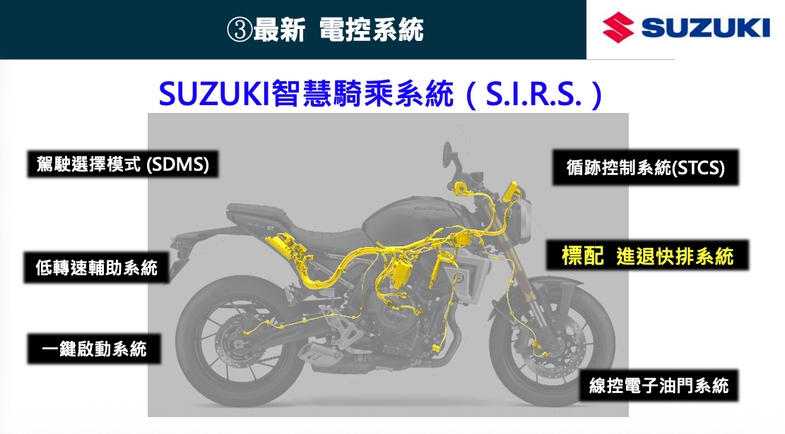 為了讓騎士能安心享受騎乘樂趣,SUZUKI 並沒有因為復古定位而犧牲科技配備。兩車皆搭載完整的電控系統:SDMS 三段動力模式選擇、STCS 循跡控制系統、進退檔快排系統 (Bi-directional Quick Shift System)、Ride-by-Wire 電子油門