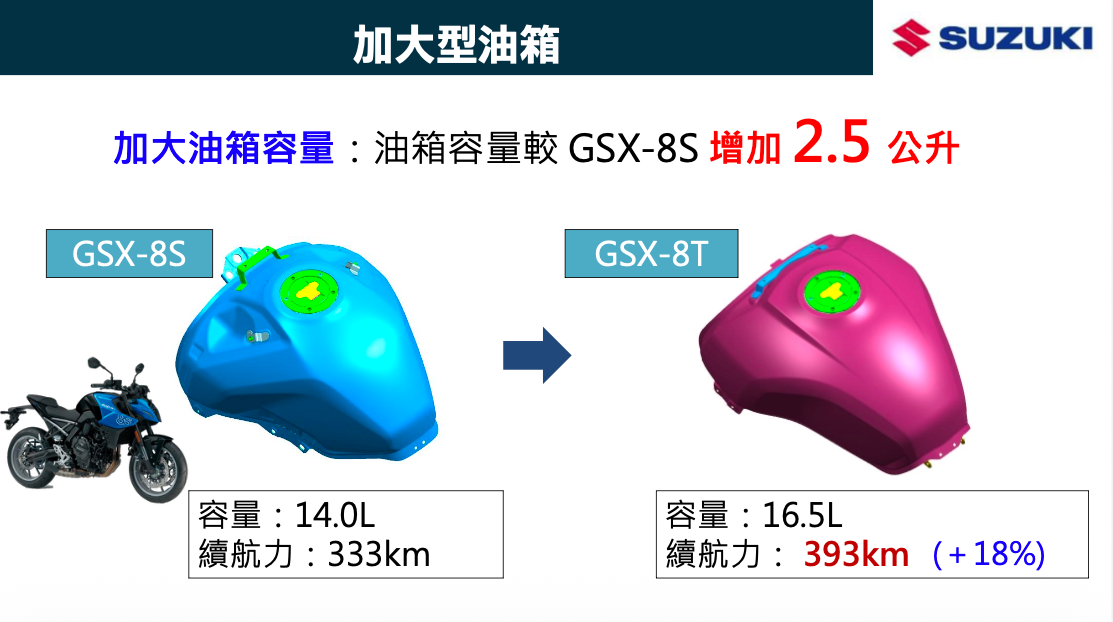 同時在油箱設計上,SUZUKI不跟隨其他復古車款使用水滴狀油箱,改為稜角感受更強的風格提升車款辨識度,同時相較於 8S 容量提升2.5公升,來到16.5公升,兼顧造型與提升續航表現。