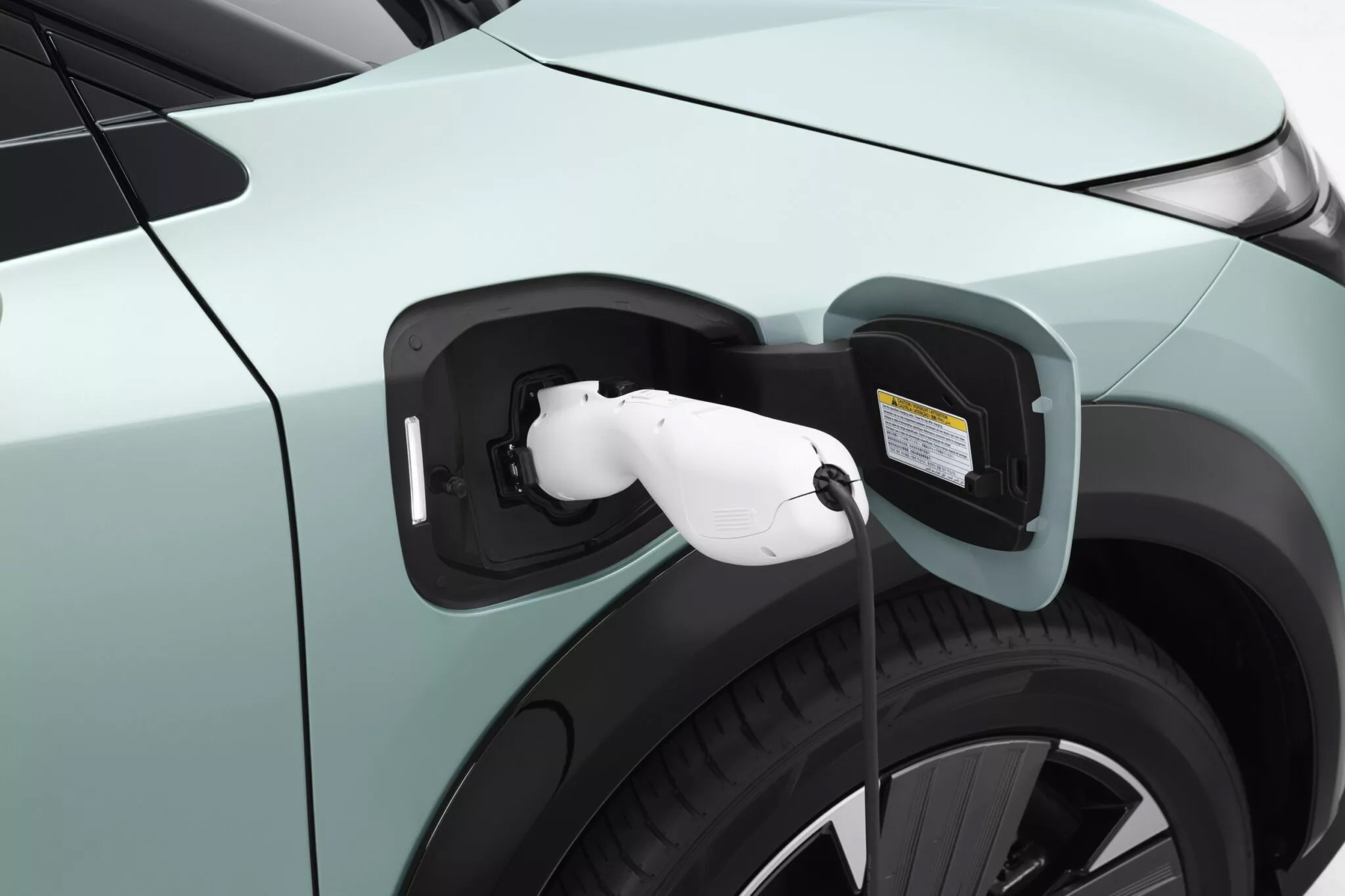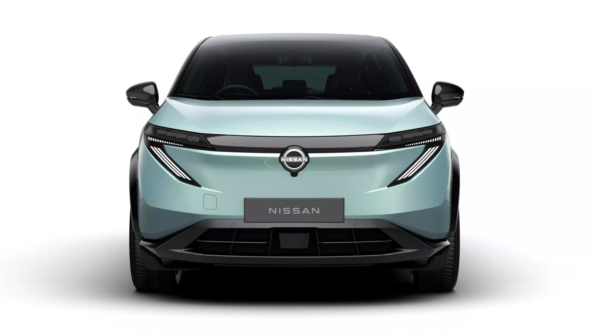 改款後的 2026 年式 Ariya 在外觀上展現了更洗鍊的視覺張力。車頭捨棄了過往較為複雜的飾板結構,改採無格柵式的簡約設計,搭配造型更顯犀利的「LED 獠牙」日行燈與重新修飾的前保桿,視覺重心更加低平且具侵略性。此外,新款 20 吋鋁合金輪圈採用鋁合金與樹脂材料複合製成,在優化空氣力學的同時也減輕了簧下重量。車色方面則新增了「翡翠光」(Hisuinohikari)新色,以鮮明的電漿綠車身搭配黑色車頂、鋼琴烤漆飾條,打造極具未來感的視覺對比。