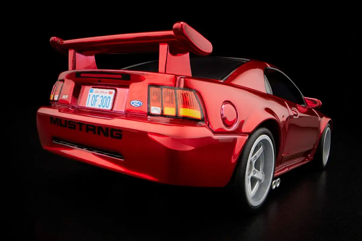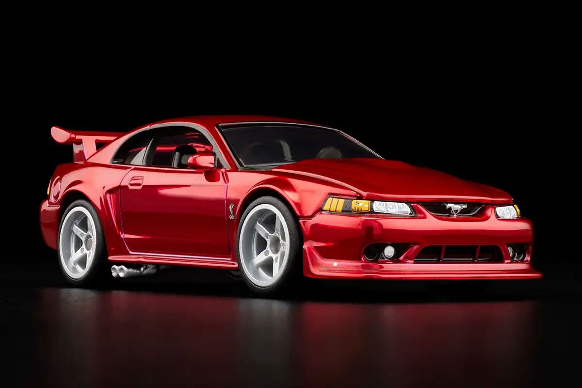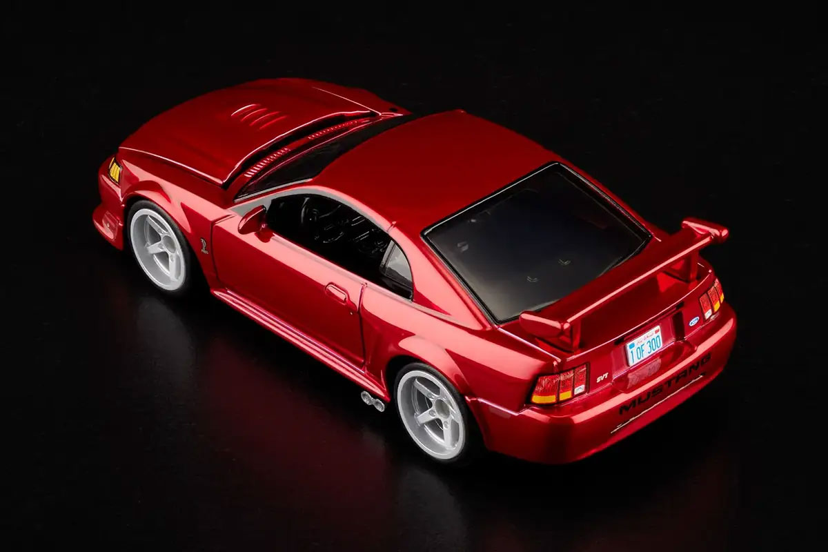 2000 Ford Mustang SVT Cobra R 則以 Performance Red 為主色,搭配黑色座艙與專屬 SVT 細節。車身比例與尾翼設計忠實還原當年的高性能版本,並配備十幅輪圈。