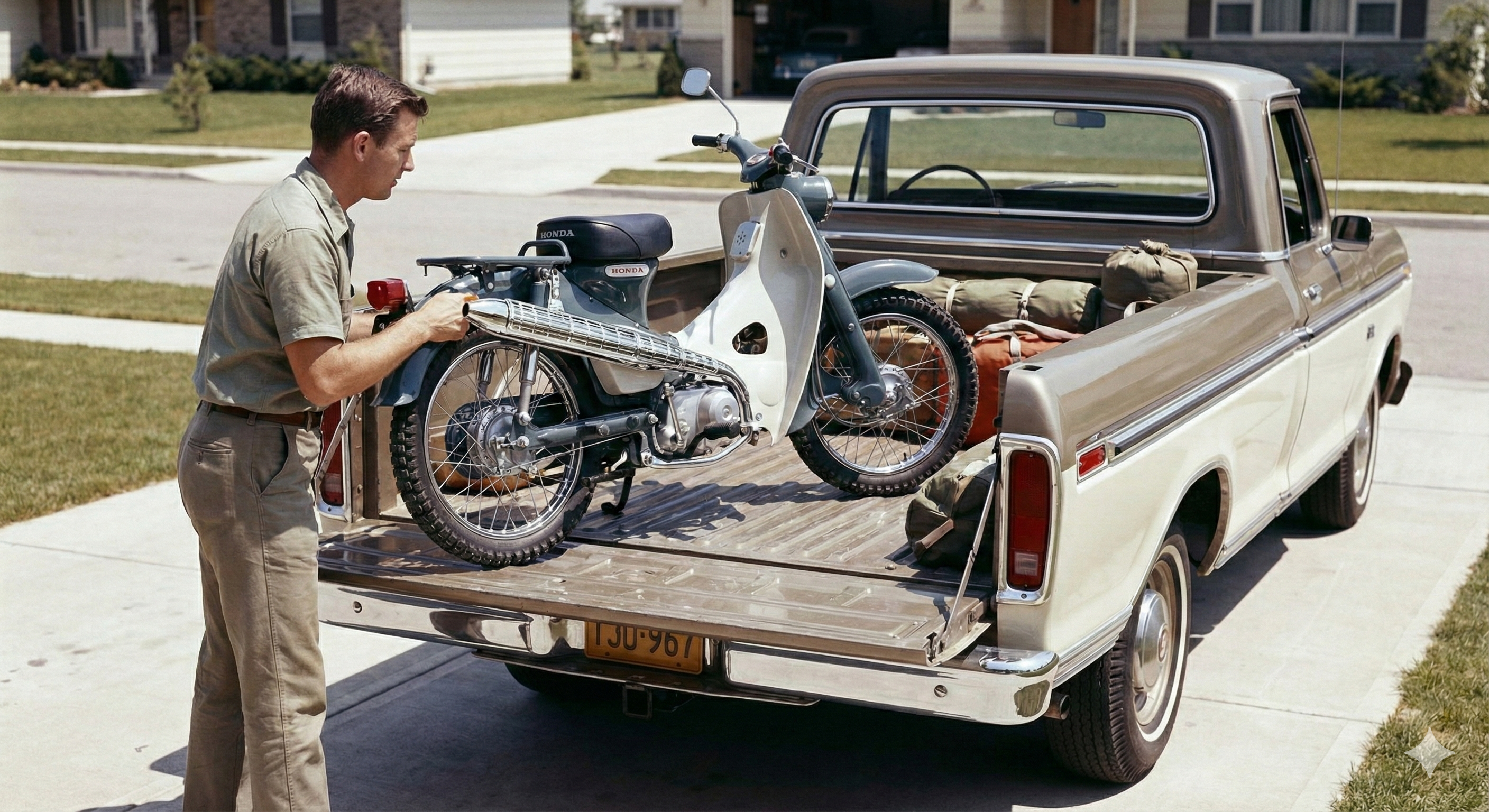 面對倉庫裡堆積如山、根本賣不出去的 Super Cub,Honda 的美國團隊並沒有坐以待斃,他們觀察到美國人有一種非常獨特的生活方式,那就是開著大皮卡(Pickup Truck),把休閒裝備往後斗一丟,週末就往荒郊野外跑。