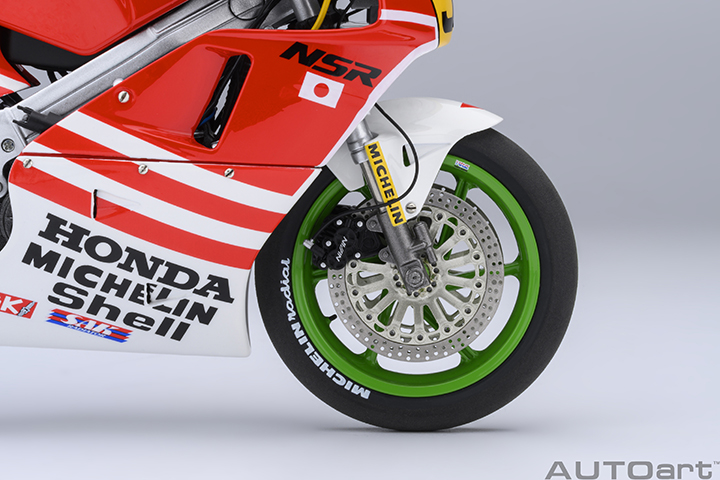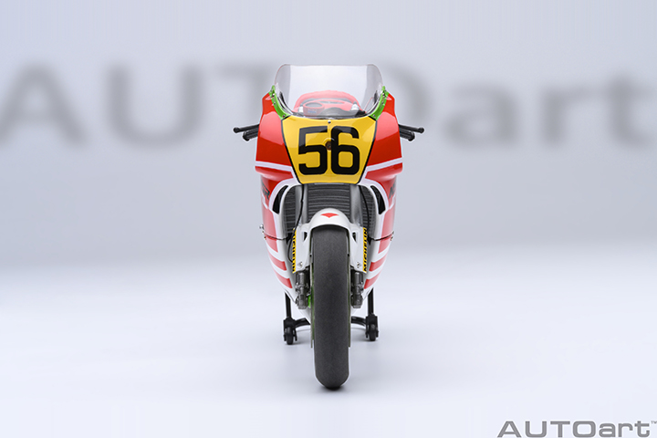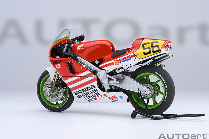 這款模型最大的賣點,在於它不是單純把漫畫裡的車做出來,而是追求極致的真實感。AUTOart 特別與 Honda 合作,對真實的 NSR500 賽車進行全車 3D 掃描,從引擎結構到車架幾何都擁有實車級的數據。在此基礎上,團隊再融入漫畫中巨摩郡參戰 WGP500 時的經典塗裝、贊助商 Logo 與那標誌性的「56」號車號。這種將二次元情懷與三次元精密機械結合的工藝,讓它具備了極強的說服力。