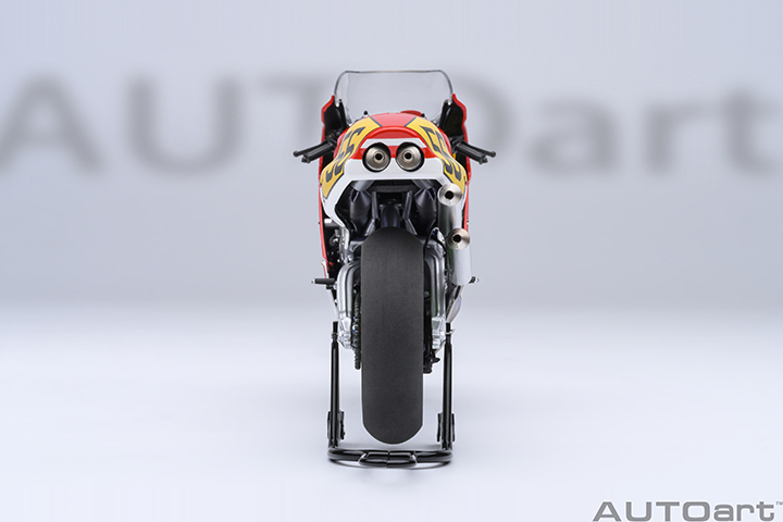 為了兼顧外觀銳利度與手感,AUTOart 採用了專利的「複合壓鑄(Composite Diecast)」製法。車架與搖臂等核心結構採用「金屬壓鑄」,確保拿在手上的重量感與剛性;而外觀整流罩則使用高品質 ABS 塑膠,以呈現最銳利的線條與精準的密合度。 最讓機械迷興奮的是,全車整流罩皆為可拆卸式設計!拆下外殼後,你可以清楚看到那具由 3D 掃描建模的 V4 引擎、帶有燒色質感的膨脹室排氣管,以及巨大的散熱水箱。此外,前後懸吊皆為可動設計,煞車碟盤更使用了金屬材質並施以髮絲紋處理,細節之高簡直就像把縮小燈照在實車上一樣。