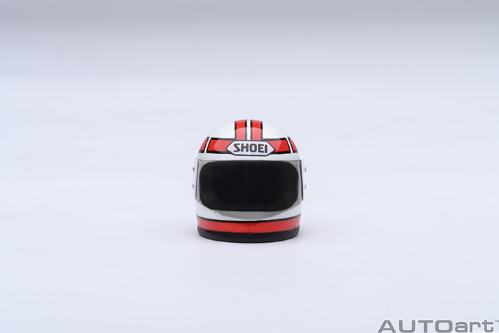 為了讓整體的展示氛圍更完整,原廠這次展現了滿滿誠意,隨車附贈了一頂 1/12 比例的「巨摩郡安全帽」。雖然鏡片不可動,但完美還原了 WGP 時期的經典紅白線條塗裝。試想一下,將這頂安全帽放在 NSR500 的座墊或油箱上展示,那種彷彿巨摩郡剛剛跑完比賽回到 Pit 區的臨場感,絕對會讓老粉感動不已。