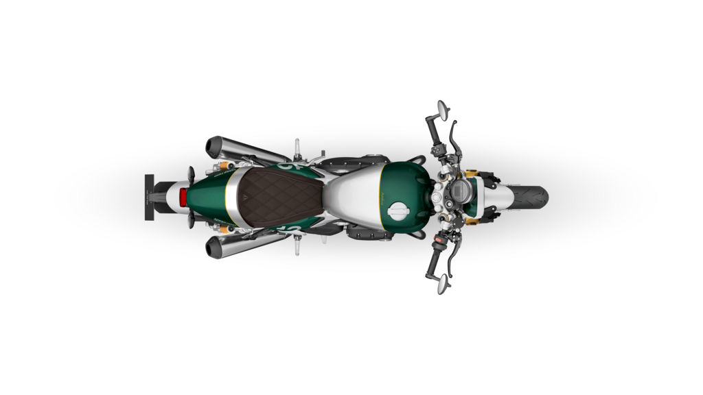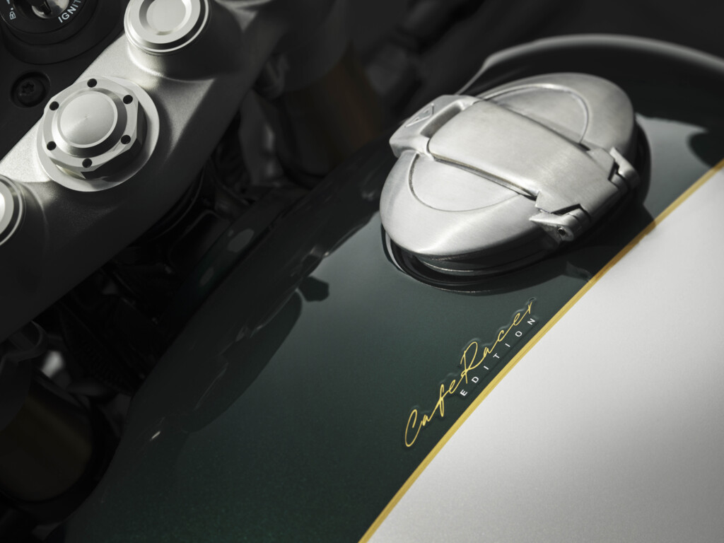 車身塗裝更是細節狂魔的傑作,油箱以大面積的鋁合金銀作為基底,搭配具有深度質感的競賽綠飾板,中間則是由職人精準描繪的 Empire Gold 金色線條。更騷的是,大燈碗公與前叉護蓋也同步噴上了競賽綠,側蓋上大大的「12」號碼牌字樣則是在向凱旋輝煌的賽道歷史致敬,這種高級的色彩層次,確實讓它在眾多現代復古車中脫穎而出。