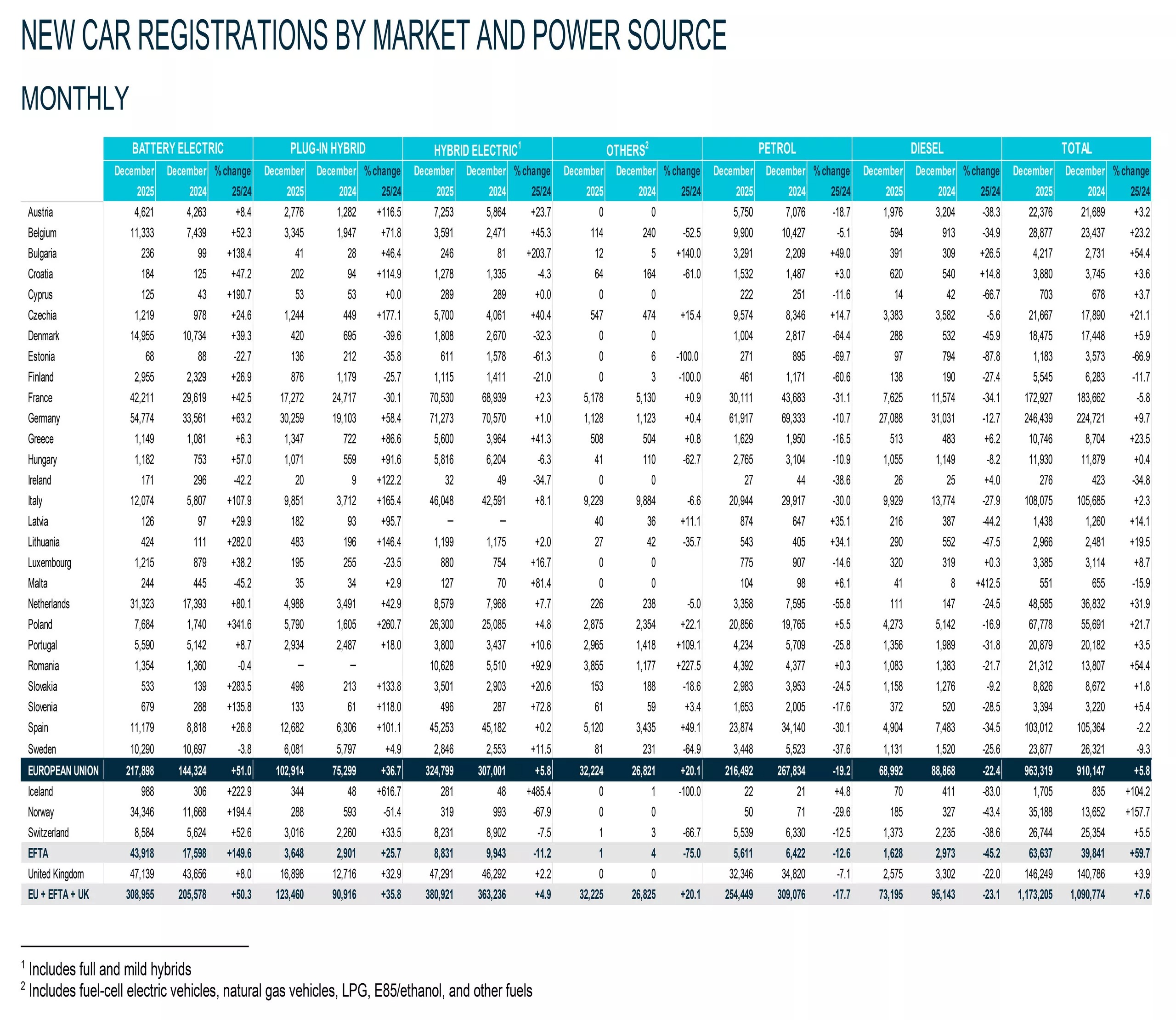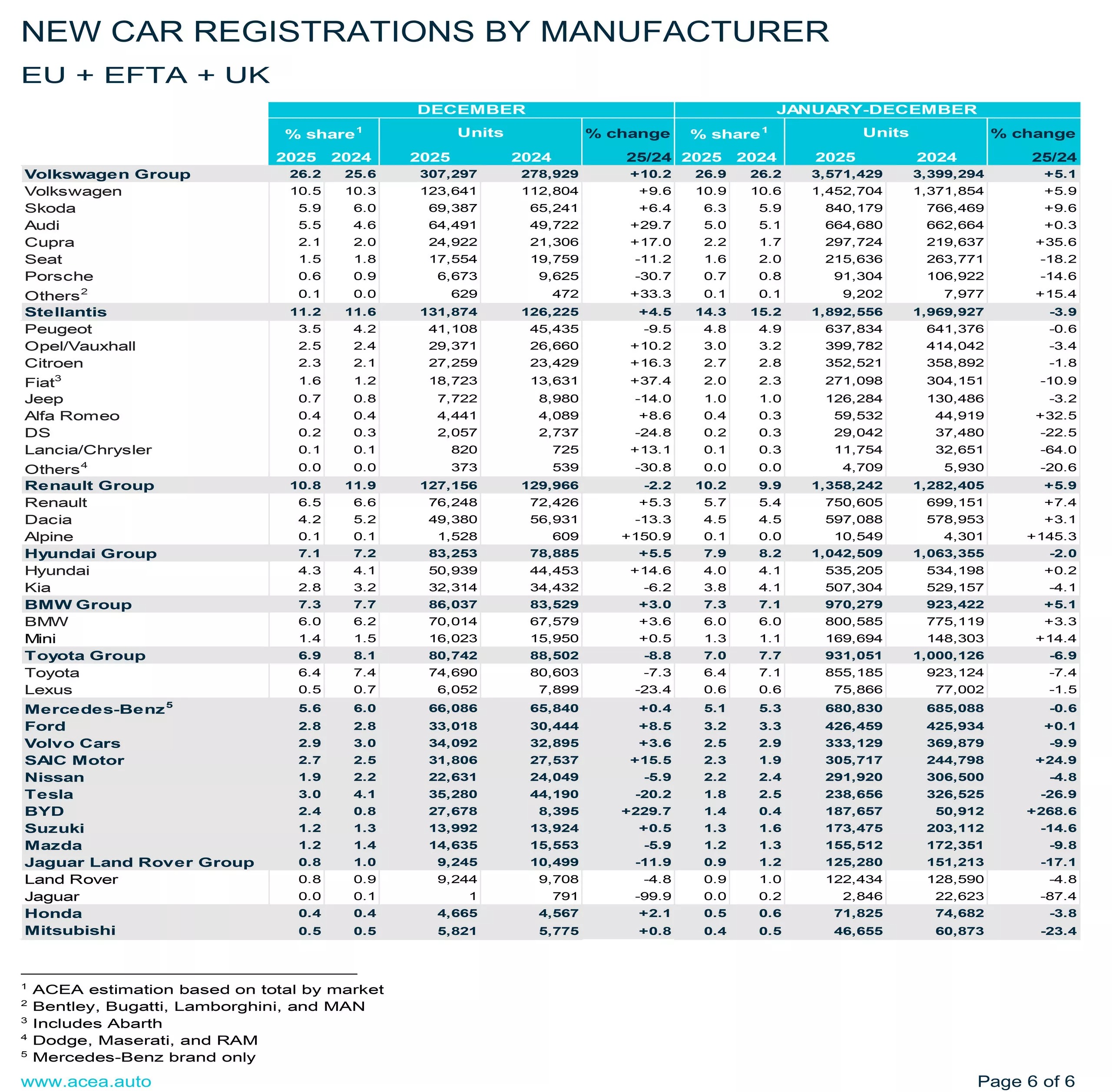 2025年對於歐洲汽車產業而言,是個充滿戲劇性轉折的一年。根據歐洲汽車製造商協會(ACEA)最新公布的年度數據,歐洲(含歐盟、英國及EFTA國家)新車掛牌量達1,327萬輛,較去年微幅增長2.4%。然而,比起總體銷量,動力結構的劇烈洗牌才是真正的焦點:純電動車在12月的單月市佔率歷史性地超越了傳統純汽油車。儘管這是一場微弱的勝出,卻釋放出了一個明確的信號,歐洲消費者的購車天秤已向電動端傾斜。