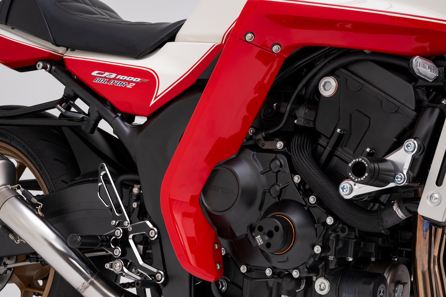 PLOT 這回最讓媒體與車迷瘋狂的舉動,莫過於那具巨大的半整流罩,他們並非隨便訂製一組現代造型,而是直接找來 1982 年 CB750FC Integra 的原廠部品,透過 PLOT 研發的專屬支架硬生生地將其「掛」在 CB1000F 上。